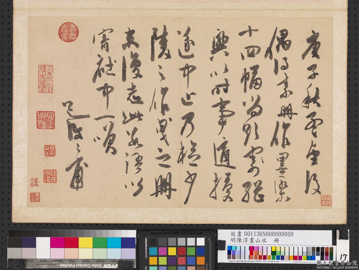 簡介:此件為明陳淳畫山水冊,共17開,其中15-17為書法。