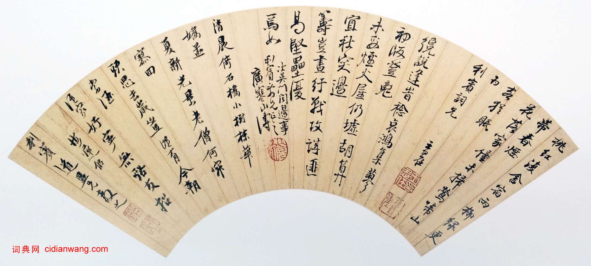 陳洪綬《行書五律詩》扇面(與王思任、吳山濤合作) 金箋 17×54cm 約順治四年(約1647)上海博物館藏