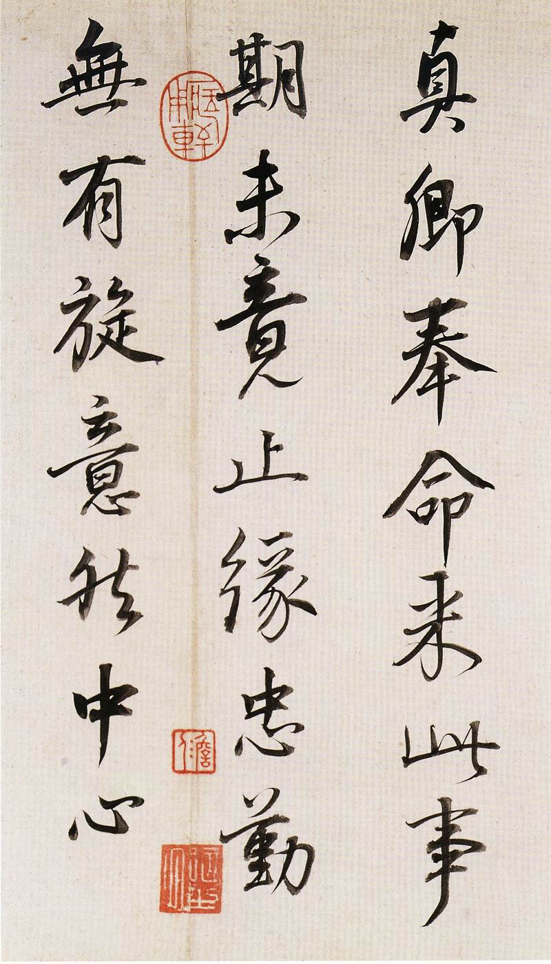 董其昌臨《顏真卿奉命帖》,這幅作品是典型的董其昌風格,淡墨寫就,筆法流暢,恬淡嫻雅。