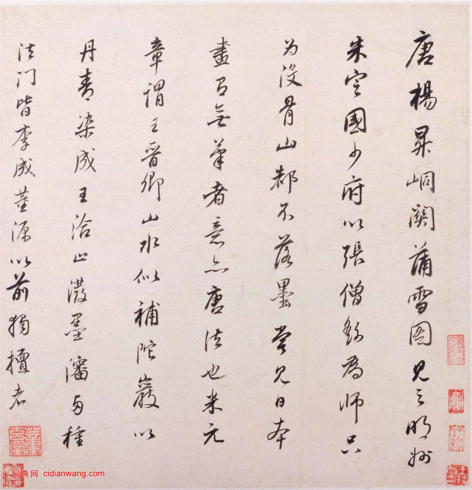 “唐楊昇峒關蒲雪圖,見之明州朱定國少府,以張僧繇為師,只為沒骨山,都不落墨。曾見日本畫有無筆者,意亦唐法也。米元章謂王晉卿山水似補陀岩,以丹青染成。王洽正潑墨瀋。多種法門皆李成、董源以前獨善者。”