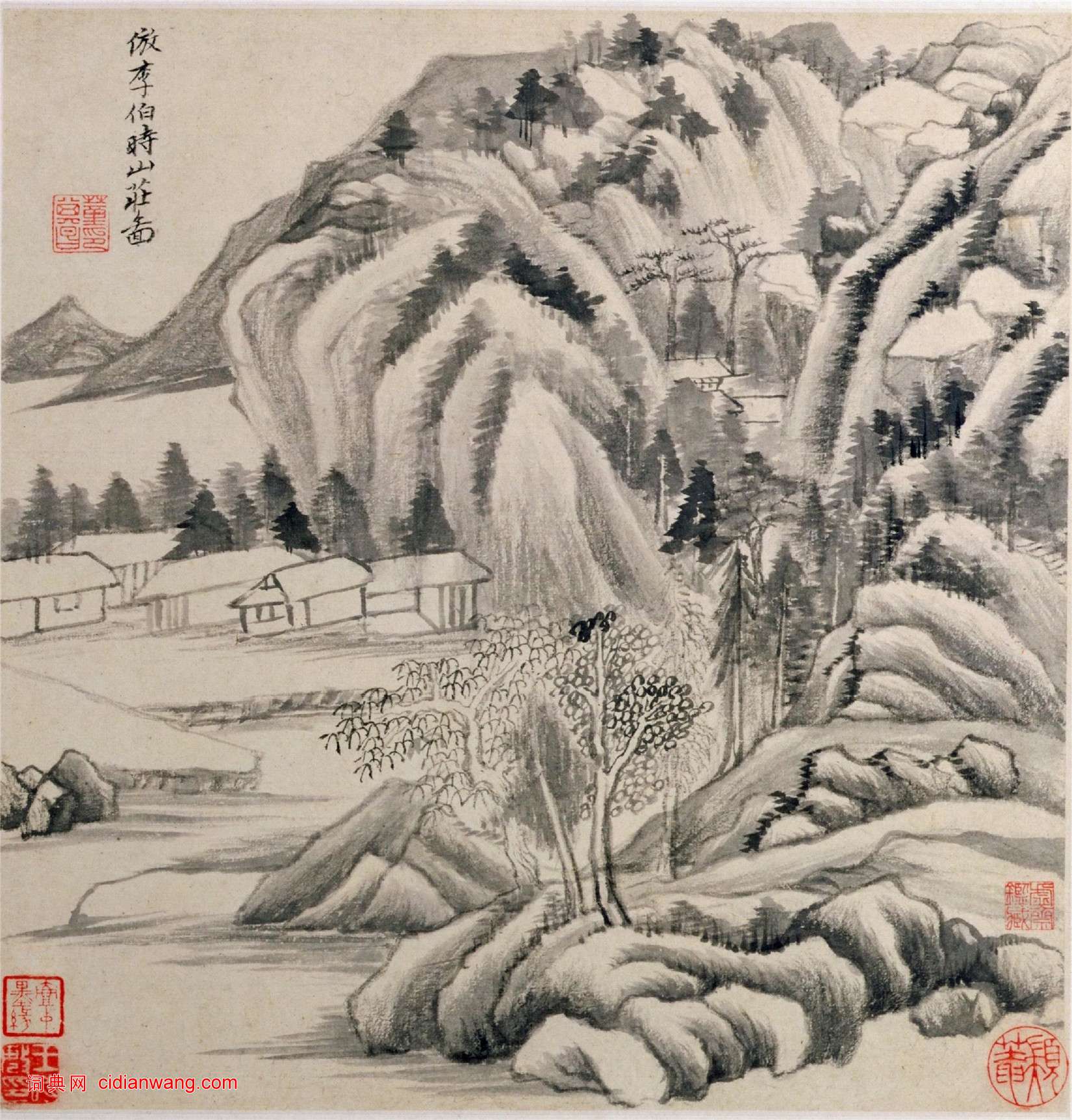 右上題:“仿李伯時山莊圖。”鈐“董其昌印”。收藏印有“王時敏印”、“顓庵”、“壺中墨緣”、“虛齋鑑藏”。