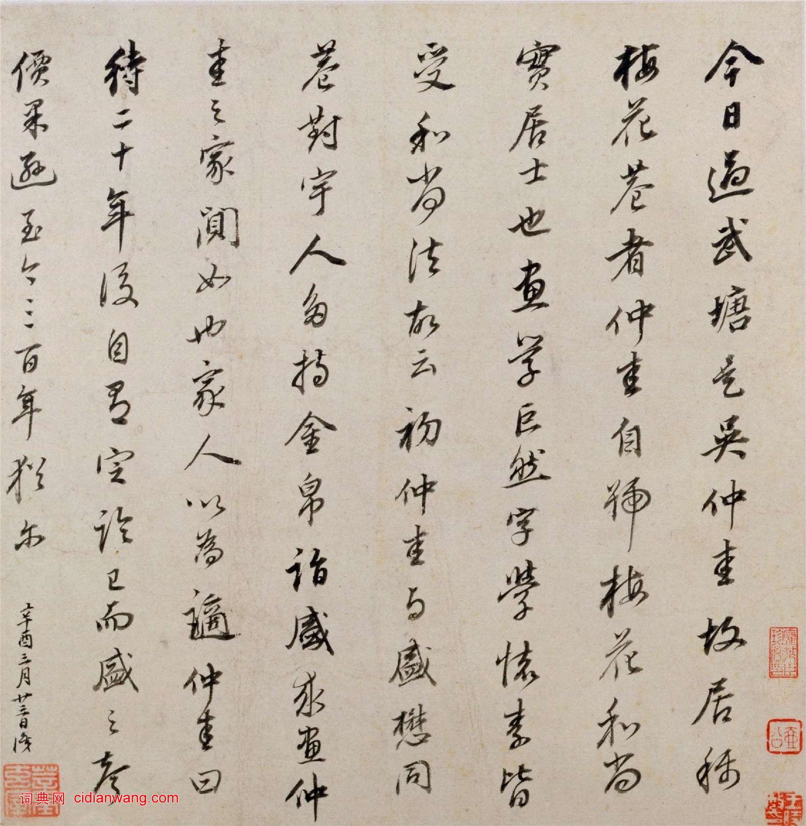 “今日遇武塘題吳仲圭故居,稱梅花巷者。自號梅花和尚,實居士也。畫學巨然,字學懷素,皆受和尚法,故云。仲圭與盛懋同巷對宇。人每指金帛詣盛求畫,仲圭之家聞如也。家人以為謫,仲圭曰:‘待二十年後自有定論’。已而盛之身價果遜。至今三百年猶爾。辛酉三月廿三日識。”