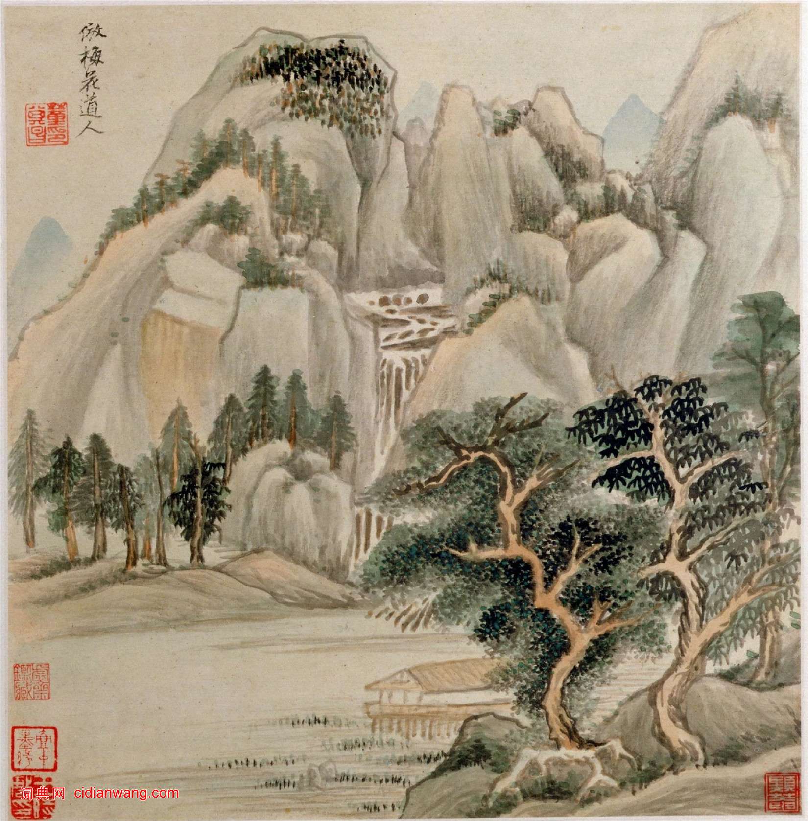 左上角題:“仿梅花道人。”鈐“董其昌印”。收藏印鈐“虛齋鑑賞”、“壺中墨緣”、“王時敏印”、“顓庵”。