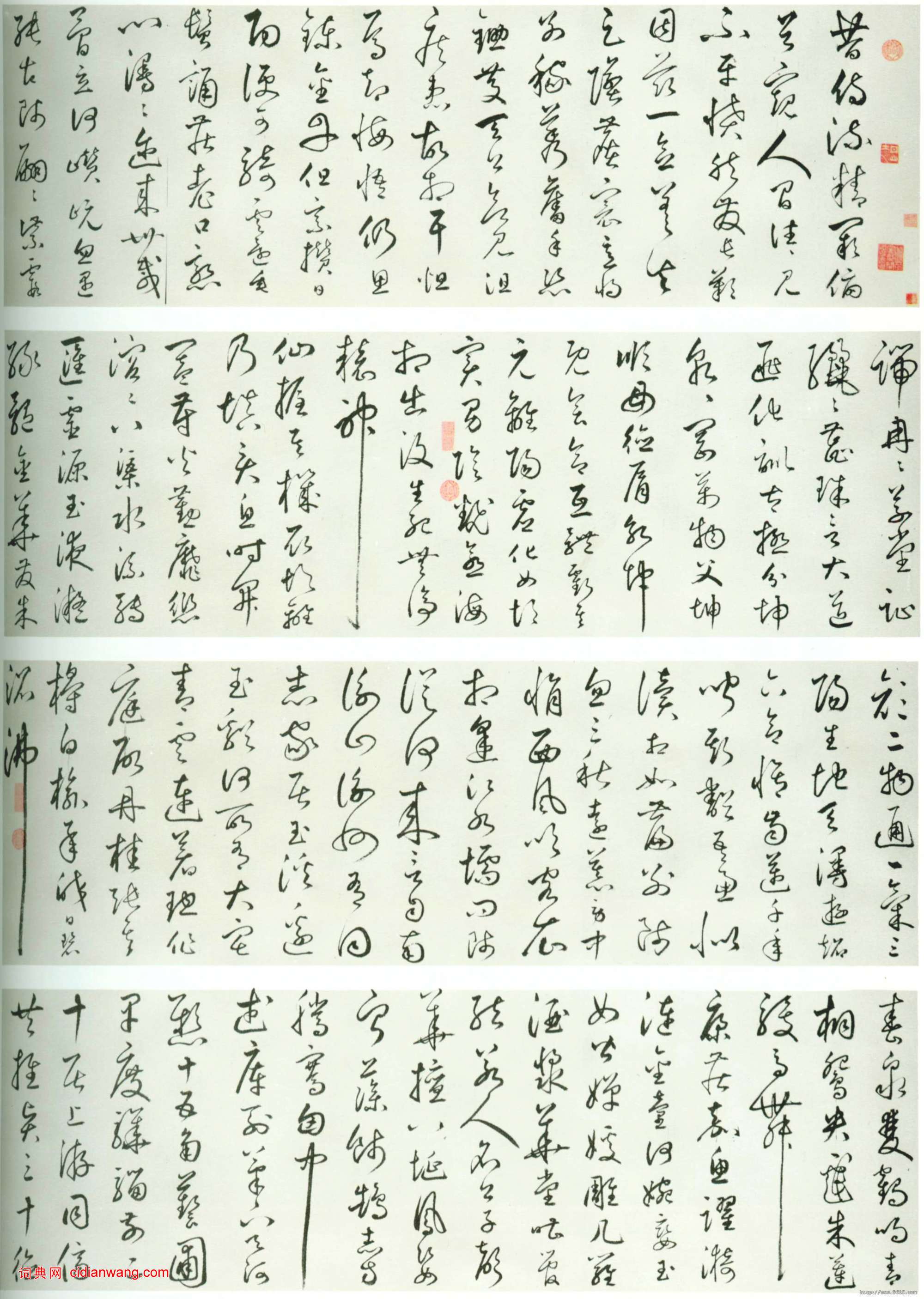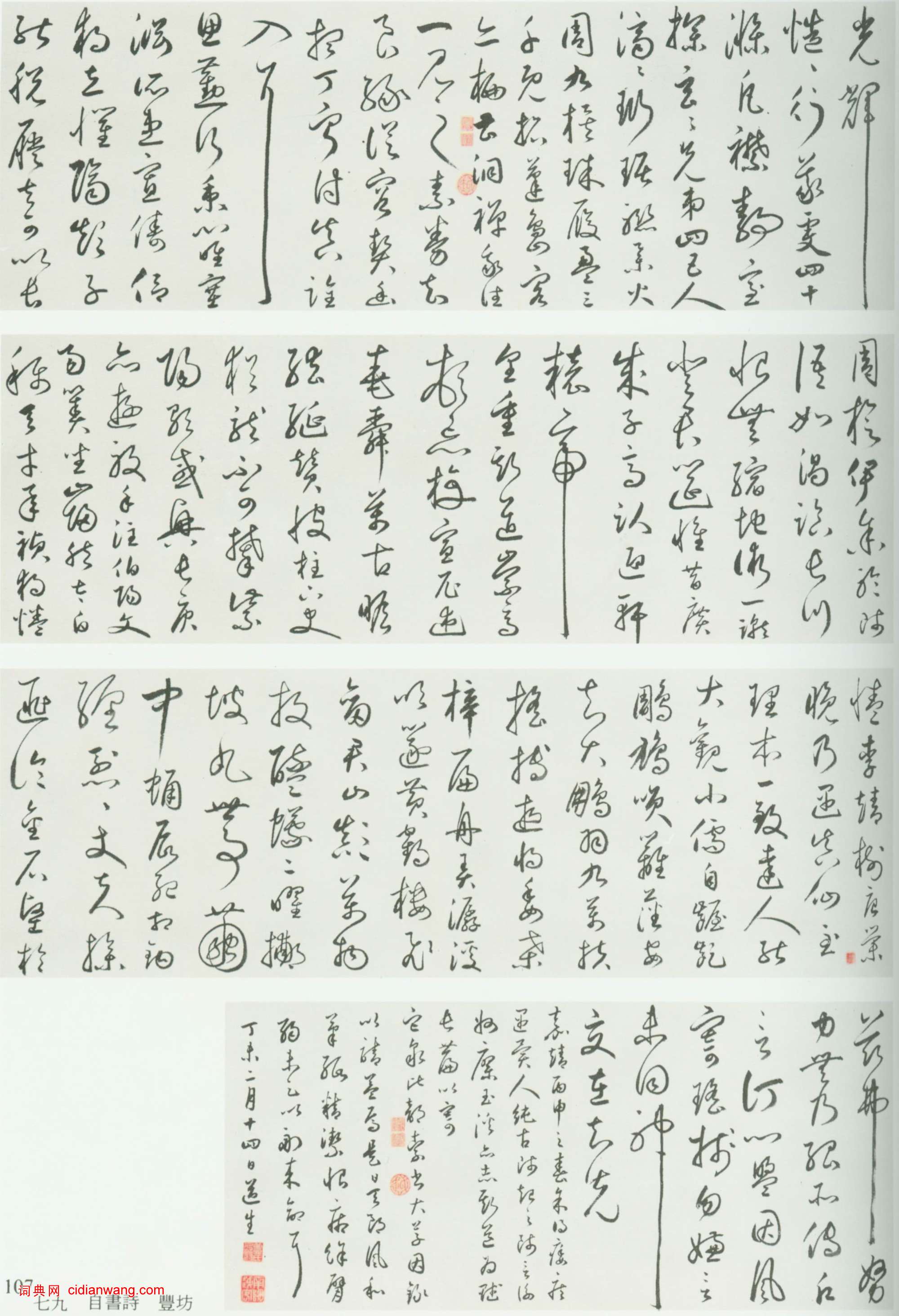 豐坊《自書詩卷》縱33.4cm,橫772.5cm,草書,124行,北京故宮博物院藏,手卷。卷後有清范永祺題記。鈐“豐氏人翁”、“南隅越客”、“晉雲郡開國侯裔”、“丹山赤水”等印。收藏印鈐“竹初寓目”、“□□珍藏”。