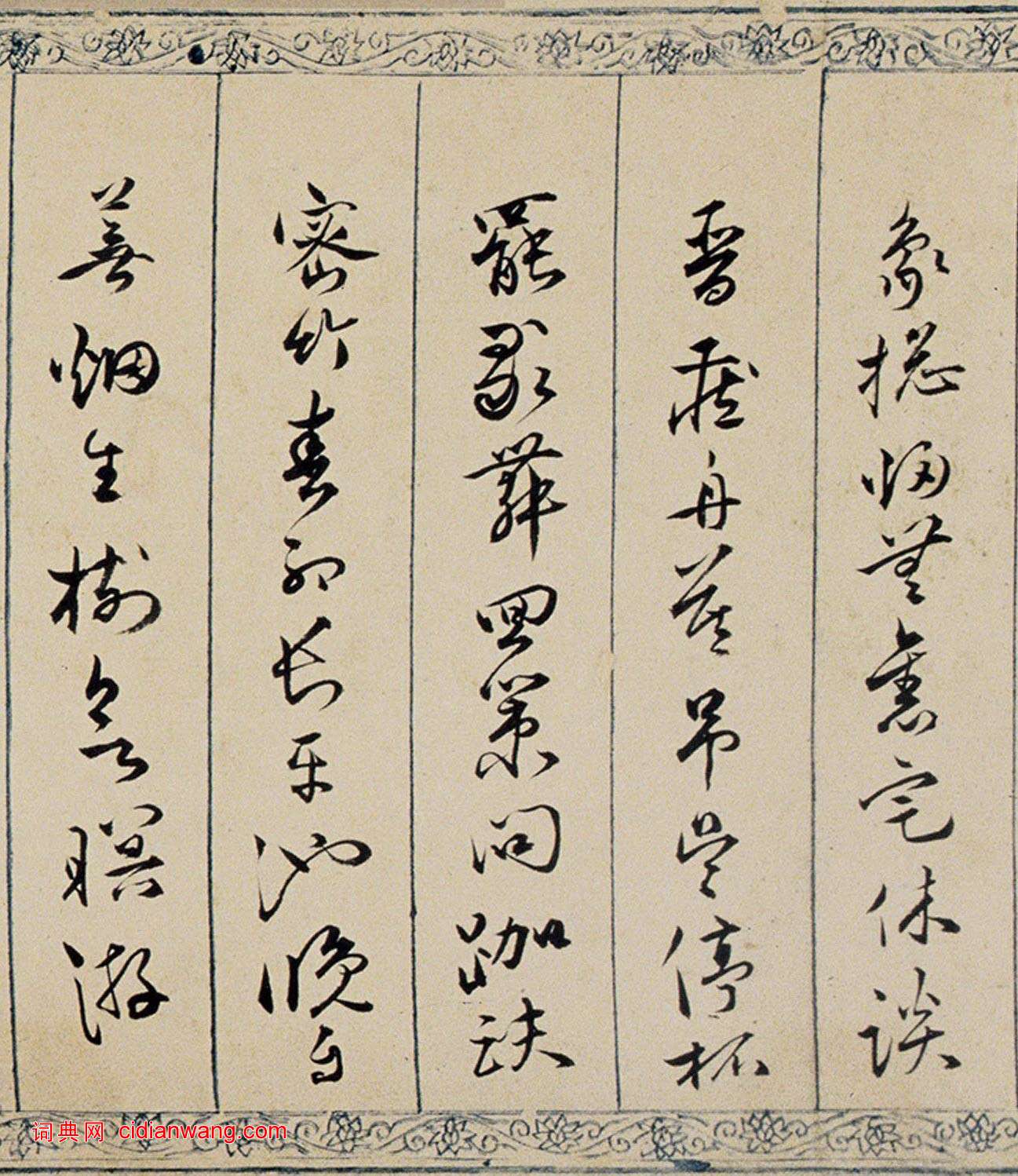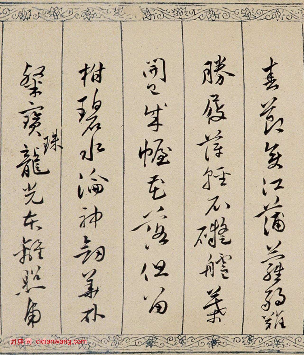 資源下載魏晉書法唐朝書法宋朝書法元朝書法明朝書法清朝書法近現代書法字典網>> 歷代書法>> 明朝>> 皇甫沖《題唐寅“金閶送別圖”詩跋》(3)正文 皇甫沖《題唐寅“金閶送別圖”詩跋》(3)作者:皇甫沖 書體:行書 首 頁 上一頁 1 2 3 全文2018-5-30 10:17:30 皇甫沖的相關書法作品:皇甫沖《題唐寅“金閶送別圖”詩跋》 皇甫沖·題唐寅《金昌送別圖》詩 相關文章:東漢隸書《陽嘉殘碑》 (隸書)陽嘉殘碑,東漢陽嘉二年刻,清光緒元年出土於曲阜,碑陽存10行,碑陰存3列。用筆精...張雨《台仙閣記行書卷》 (行楷)張雨《台仙閣記行書卷》綾本 35.6×172.3cm ,書於至正五年(1345...王鐸《草書冊》 (草書)王鐸《草書冊》 海外華裔私人藏釋文:當秋暮雨煙欲飛,鶴來亭樹, 攜榼登嘯,殊開...趙孟頫楷書《崑山州淮雲院記》 (楷書)元·趙孟頫 楷書《崑山州淮雲院記》,此帖是趙書成熟時期的大楷書代表作。書法風格...歐陽詢隸書《房彥謙碑》 (隸書)歐陽詢《房彥謙碑》拓本,隸書 貞觀五年(631)立 北京論經書詩齋藏“房彥謙碑”...清朝皇帝筆下的福書法欣賞“五福臨門”指的是哪“五福”?“五福”這個名詞,源於《書經·洪範》,現在已是家...毛奇齡《行書即事詩軸》 (行書)毛奇齡《行書即事詩軸》紙本行書 115×40cm 遼寧省博物館藏釋文:曾共登樓...丁敬《隸書題文昌道院壁詩軸》 (隸書)丁敬《隸書題文昌道院壁詩軸》紙本隸書 128.7×33.5cm 浙江省博物館藏...張問陶《行書詩軸》 (行書)張問陶《行書詩軸》,紙本,縱106cm,橫42cm。深圳市博物館藏。張雨行書《澱湖社集尺牘》 (行書)張雨《澱湖社集尺牘》紙本 25.6×36.7cm 無紀年 台北故宮博物院藏 釋...