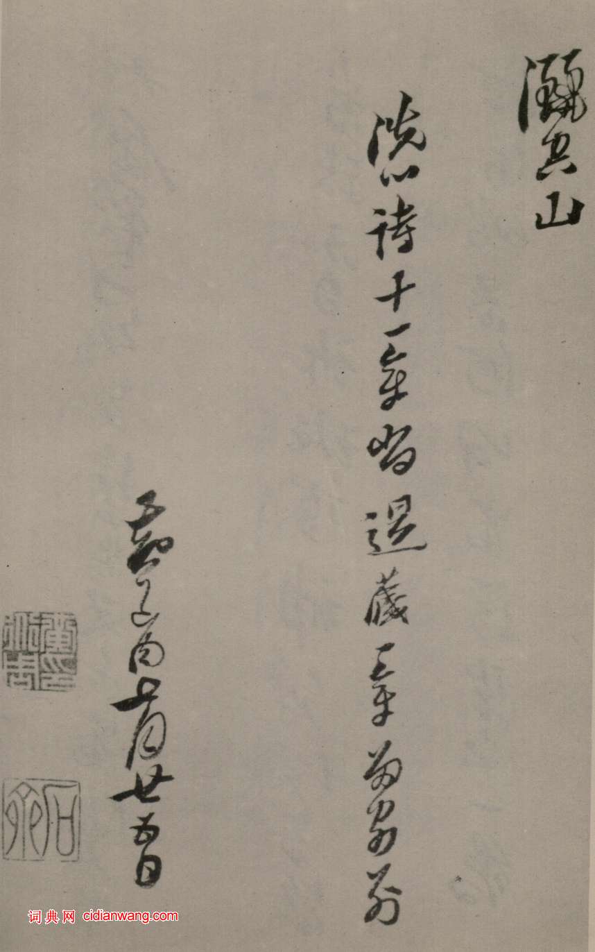 “及明亡,縶於金陵。正命之前夕,赴盥漱更衣,謂仆曰:曩某索書畫,吾既許之,不可曠也。和墨伸紙,作小楷,次行書,幅甚長,乃以大字竟之。又索紙作水墨大畫二幅,殘山剩水,長松怪石,逸趣橫生,題識後加印章,始出就刑。”