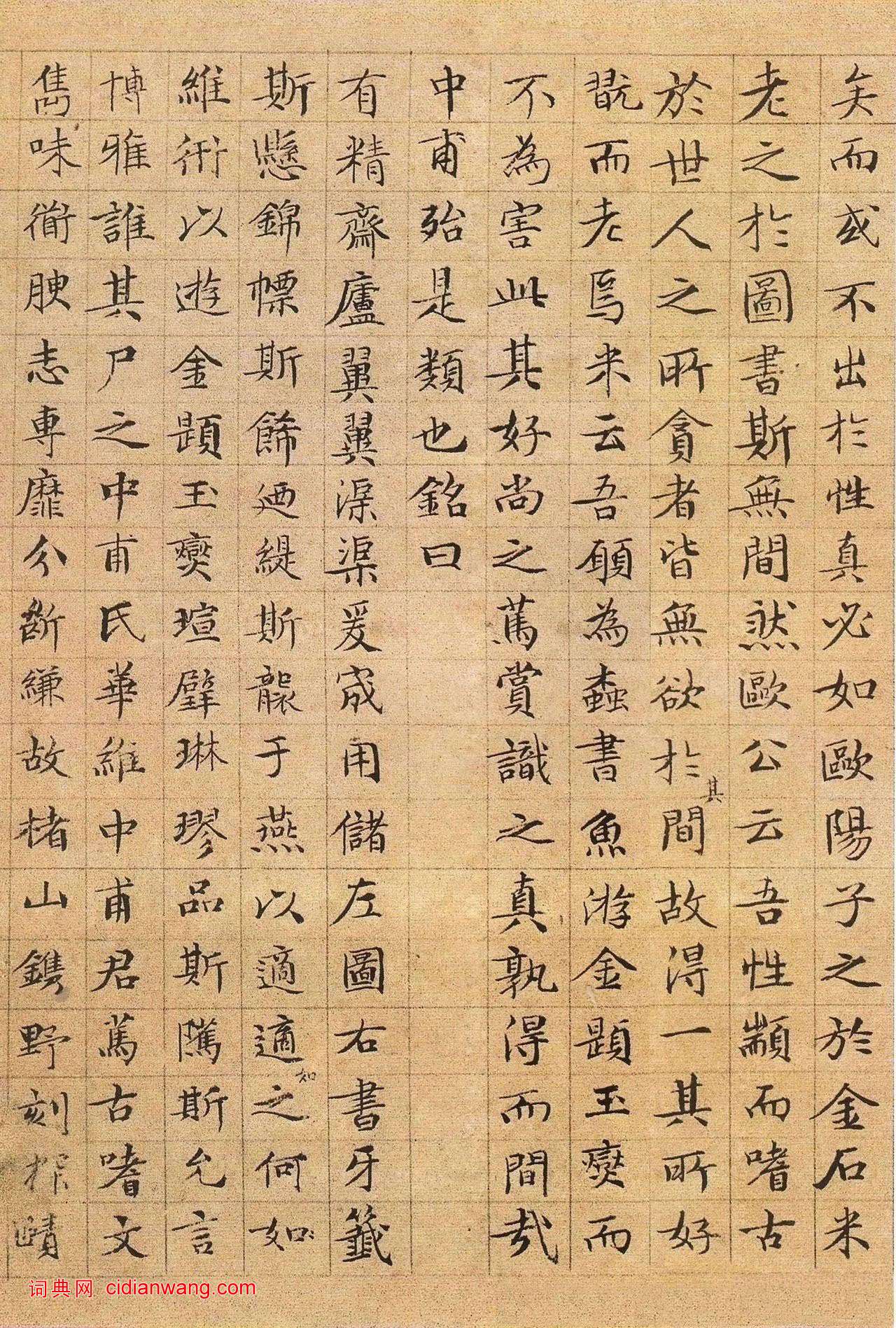真賞齋者,吾友華中父(即華夏)藏圖書之室也。中父端靖喜學,尤喜古法書圖畫、古金石刻及鼎彝器物也。家本溫厚,菑畲所入可以裕欲而於聲色服用,一不留意,惟圖史之癖,精鑒博識,得之心而寓於目,每餅金縣購,故所蓄鹹不下乙品。自弱歲抵今垂四十年,志不少怠。家坐是稍落,勿恤而彌勤。余雅同所好,歲輒過之。室廬靚深,庋閣精好,宴談之餘,焚香設茗,手發所藏,玉軸金 ,爛然溢目。法書之珍,有鐘太傅《薦季直表》,王右軍《袁生帖》、虞永興《汝南公主墓銘》起草、王方慶《通天進帖》、顏魯公《劉中使帖》、徐季海絹書《道經》,皆魏晉唐賢劇跡,宋元以下不論也。金石有周穆王壇山古刻、蔡中郎石經。淳化帖初刻定武《蘭亭》,下至黃庭、樂毅《洛神》諸帖,則其次也,圖畫器物抑又次焉。然皆不下百數,於乎富哉!今江南收藏之家豈無富於君者,然而真贗雜出精駁間存不過夸視文物取悅俗目耳。此米海岳所謂資力有餘假耳目於人意作標表者。嗚呼是焉知所好哉~若夫緹緗拾襲護惜如頭目知所好矣而賞則未也。陳列撫摩揚榷探竟知所賞矣。而或不出於性真必如歐陽子之於金石米老之於圖書斯無間然。歐公雲:“吾性顓而嗜古於世人之所貪者皆無欲於其間故得一其好玩而老焉。”米雲:“吾願為蠹書魚游金題玉躞而不為害。此其好尚之篤賞識之真孰得而間哉。”中父殆是類也。銘曰:有精齋廬翼翼渠渠。爰窚用儲左圖右書。牙籤斯縣錦幖斯飾。乃緹斯襲於燕以適。適如之何維以游。金題玉躞瑄璧琳。品斯騭斯允言博雅。誰其屍之中父氏華。維中父君篤古嗜文。雋味道腴志專靡分。斷縑故山鐫野刻。探討論手之弗釋。亶識之真亦臻厥奧。豈無物珍不易其好。維昔歐公潛志金石。亦有米顛圖書是癖。豈曰滯物寓意於斯。乃中有得弗以物移。植志弗移寄情高朗。弗滯弗移是曰真賞。有賢中父奇文是欣。少也師古老而彌勤。新齋翼翼圖籍祁祁。後有考德視我銘詩。