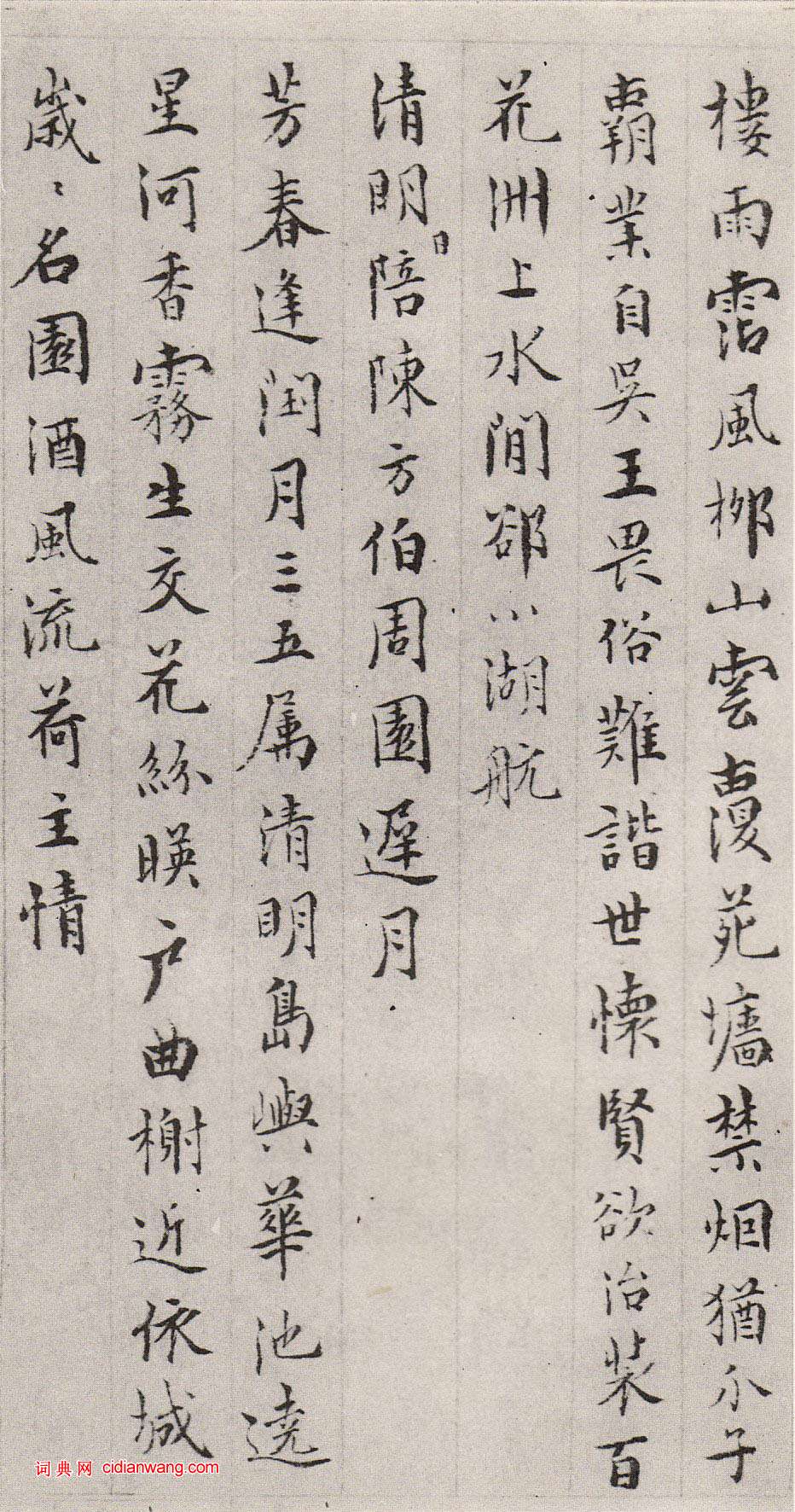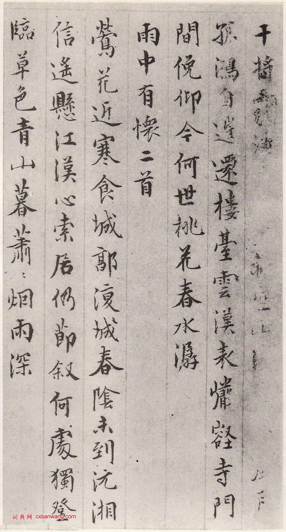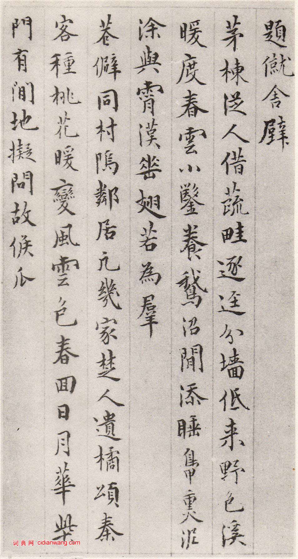資源下載魏晉書法唐朝書法宋朝書法元朝書法明朝書法清朝書法近現代書法字典網>> 歷代書法>> 明朝>> 居節《小楷詩稿冊頁》(2)正文 居節《小楷詩稿冊頁》(2)作者:居節 書體:小楷 首 頁 上一頁 1 2 3 4 5 下一頁 尾 頁 全文2018-6-17 16:51:49 居節的相關書法作品:居節·草書扇面 居節·題唐寅《溪山漁隱圖》 居節《小楷詩稿冊頁》 相關文章:鄧散木篆書《竹戶松亭五言聯》 (篆書)鄧散木《篆書五言聯》 146x37.5CMx2 憨齋吳南生私人藏釋文:竹戶掩溪...王穉登·義興雜詩冊 (行書)王穉登《義興雜詩》冊,紙本,縱二四點八厘米、橫一五點二厘米,計二五頁,每頁四行,...蔡襄《持書帖》 (行楷)蔡襄《持書帖》,紙本,行楷,縱27.2厘米,橫57.4厘米,故宮博物院藏。此帖是...陳子壯行書《五言詩軸》 (行書)陳子壯《五言詩軸》行書 台北何創時書法藝術基金會藏 釋文:春晴不十日,亦自有春情...趙佶楷書《祥龍石圖卷》題詩 (楷書)趙佶《祥龍石圖卷》絹本設色 53.8×127.5cm 北京故宮博物院藏趙佶繪畫...張瑞圖《行楷心經軸》 (行楷)張瑞圖《行楷心經軸》紙本行楷書 124.2×30.2cm 天啟七年(1627)...黃庭堅《致景道十七使君尺牘》 (行楷)黃庭堅《致景道十七使君尺牘》宋人袁立儒題跋 台北故宮博物院藏釋文:漢武故事曰。上...張瑞圖《行書不知圓通老詩》 (行書)張瑞圖《行書不知圓通老詩》軸 紙本 170×43.5厘米 年代不詳 北京故宮...唐寅行書《自書聯句詩》 (行書)唐寅《自書聯句詩》紙本行書 30.2×32.9cm 正德五年(1510年)北京...伊秉綬隸書《臨裴岑紀功碑》 (隸書)伊秉綬《臨裴岑紀功碑》隸書立軸,紙本 136.8×35.7cm,見於中國嘉德2...