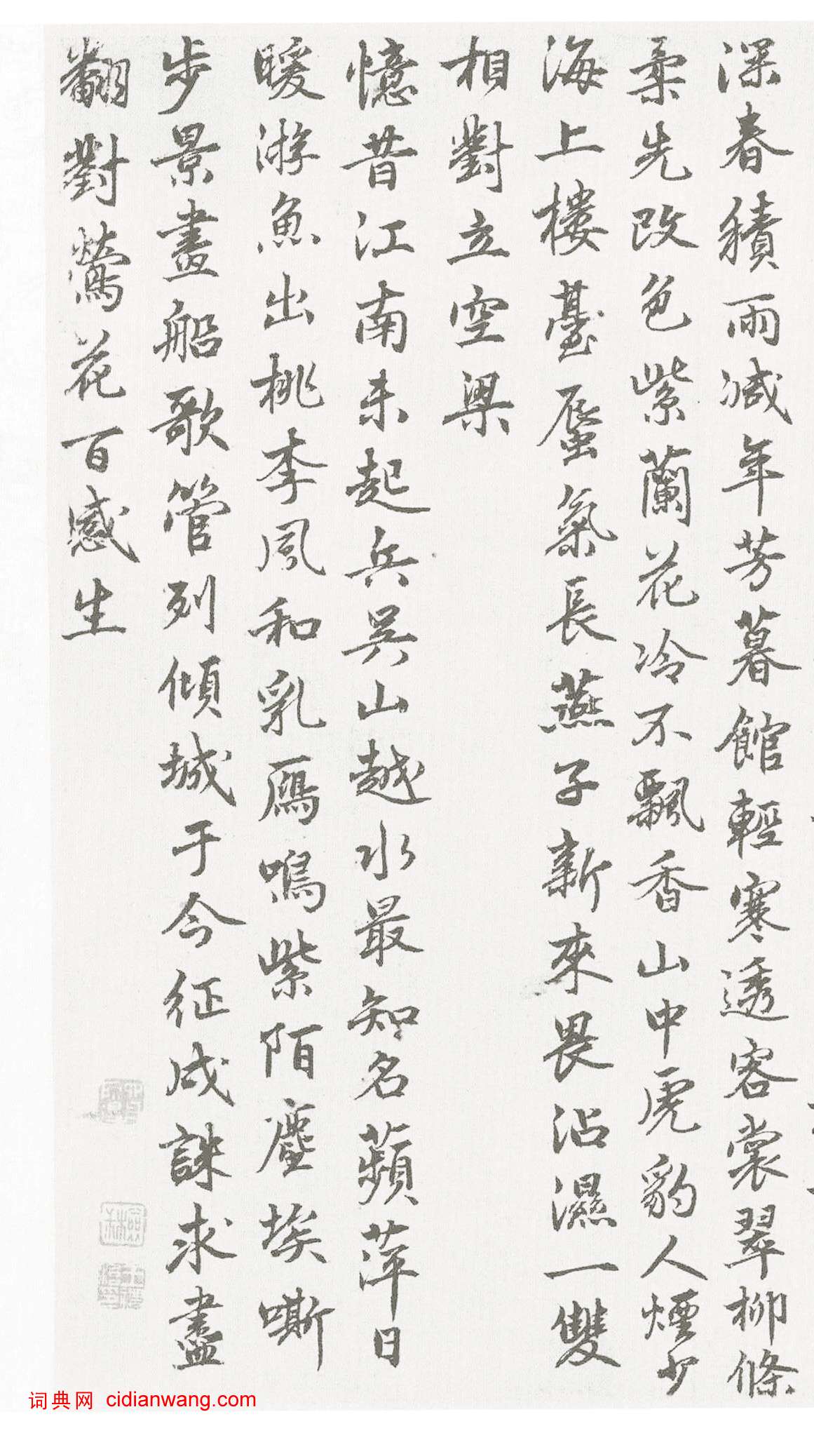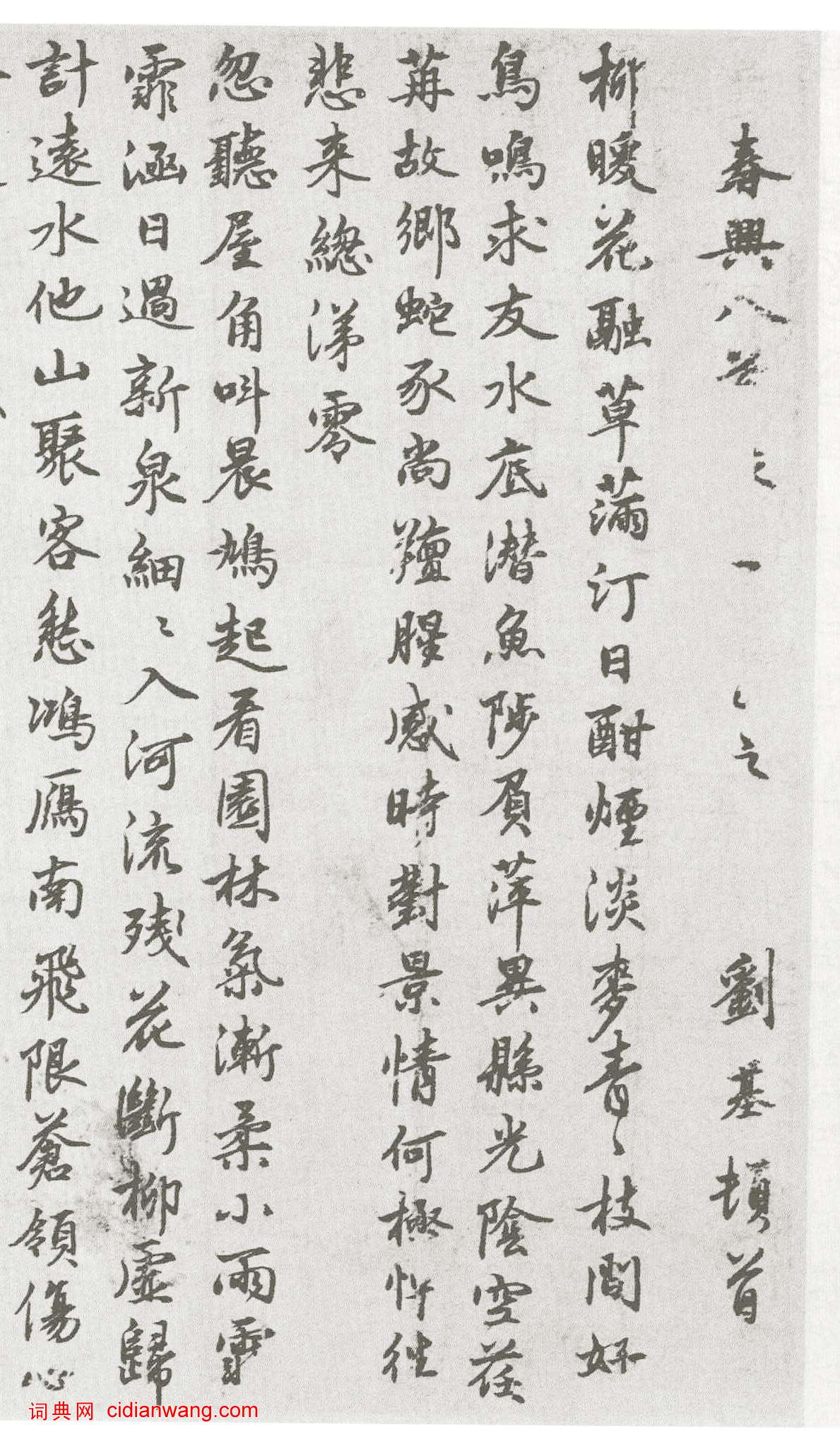 書法欣賞魏晉書法唐朝書法宋朝書法元朝書法明朝書法清朝書法近現代書法字典網>> 歷代書法>> 明朝>> 劉基《行書春興八首詩卷》正文 劉基《行書春興八首詩卷》作者:劉基 書體:行書 劉基《行書春興八首詩卷》 上海博物館藏此詩卷是劉基書寫自作的春興詩八首,書法勁挺流美,有趙松雪行書清麗秀美的特點,又有唐楷嚴謹莊重的意味。2018-6-20 15:42:37 劉基的相關書法作品:劉基跋陸柬之《文賦》 劉基《行書春興八首詩卷》 相關文章:唐國詮小楷《善見律》 (小楷)唐 國詮小楷《善見律》烏絲欄紙本,275行,行17字 縱22.6厘米 橫468....陳淳《草書千字文》 (草書)陳淳《草書千字文冊》紙本 草書 32×16.5cm×17頁 嘉靖十七年(15...司馬光隸書《王尚恭墓誌》 (隸書)《王尚恭墓誌》於1936年在洛陽北陳莊出土,刻於宋元豐七年(1084)十月。志石...懷素《小草千字文》 (草書)懷素《小草千字文》 絹本 縱33.7cm 橫1730.0cm 台北故宮博物院藏 ...趙孟頫小楷《黃庭經》 (小楷)趙孟頫小楷臨《黃庭經》彩色墨跡本,26.5*485.4厘米,北京故宮博物院藏本。...趙昀行書《禪室詩團扇》 (行書)宋理宗趙昀《禪室詩團扇》 22.9 x 24.4 cm 美國紐約大都會博物館藏 ...黃侃《行書硬黃飛白七言聯》 (行書)黃侃《行書硬黃飛白七言聯》 128×33.1cm×2 湖北省博物館藏 釋文:...包世臣楷書《贈與九楷書軸》 (楷書)包世臣《贈與九楷書軸》紙本楷書 蘭千山館藏【資料來源】《中國書法全集》第76卷-...沈右行書《風過帖》 (行書)沈右《風過帖》,行書沈右生卒年不詳,吳中人,字寓齋...劉炳森楷書《岳陽樓記》 (楷書)劉炳森字樹庵,號海村,幼年自號劉五先生。一九三七年八月出生於上海,祖籍天津武清。...