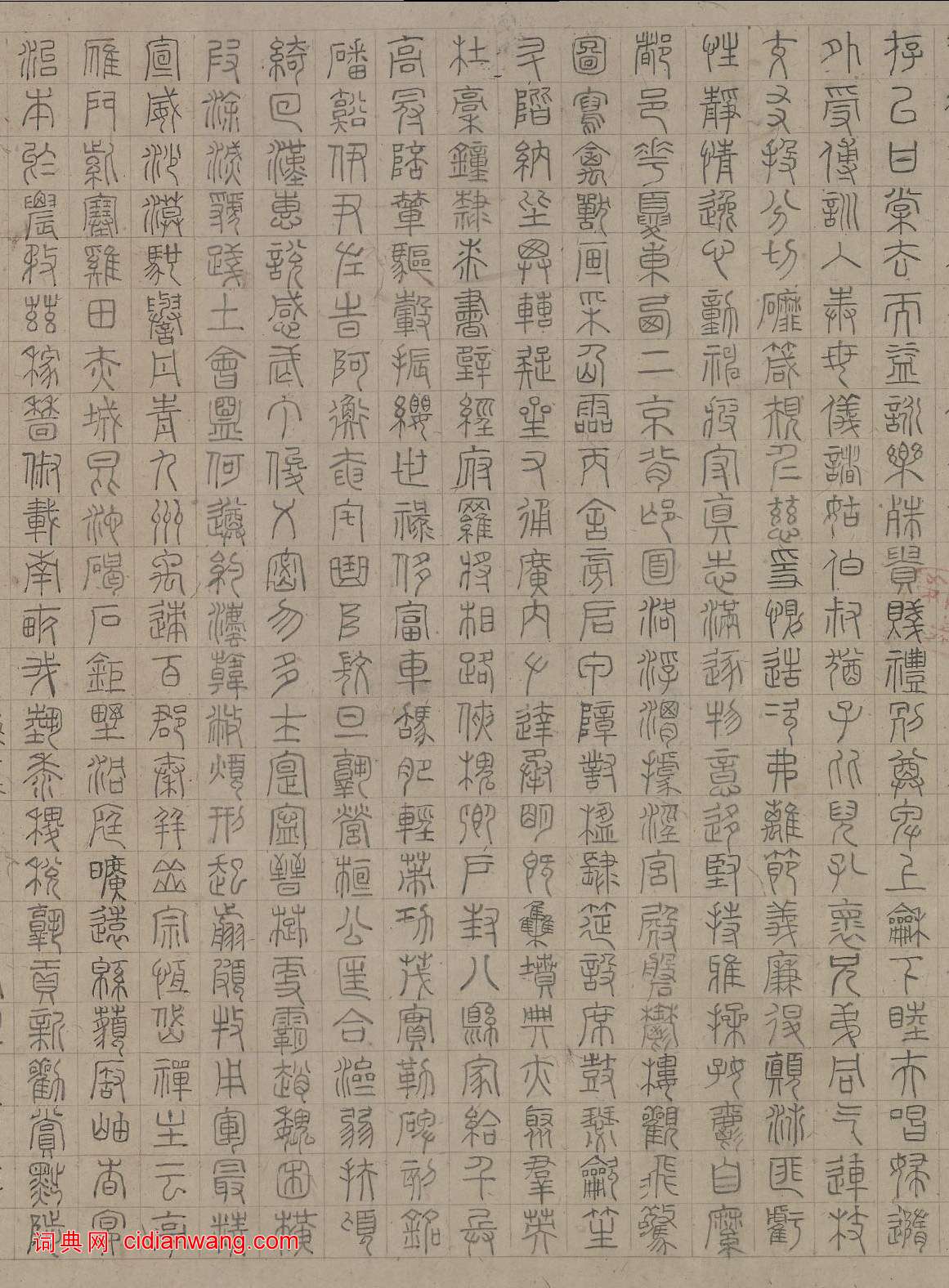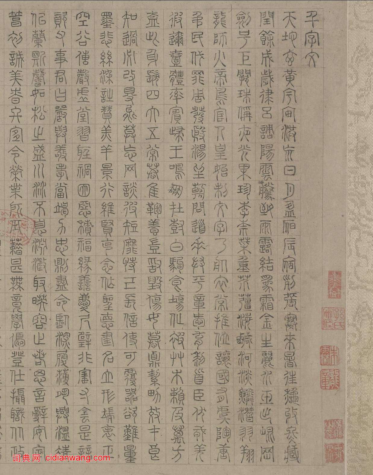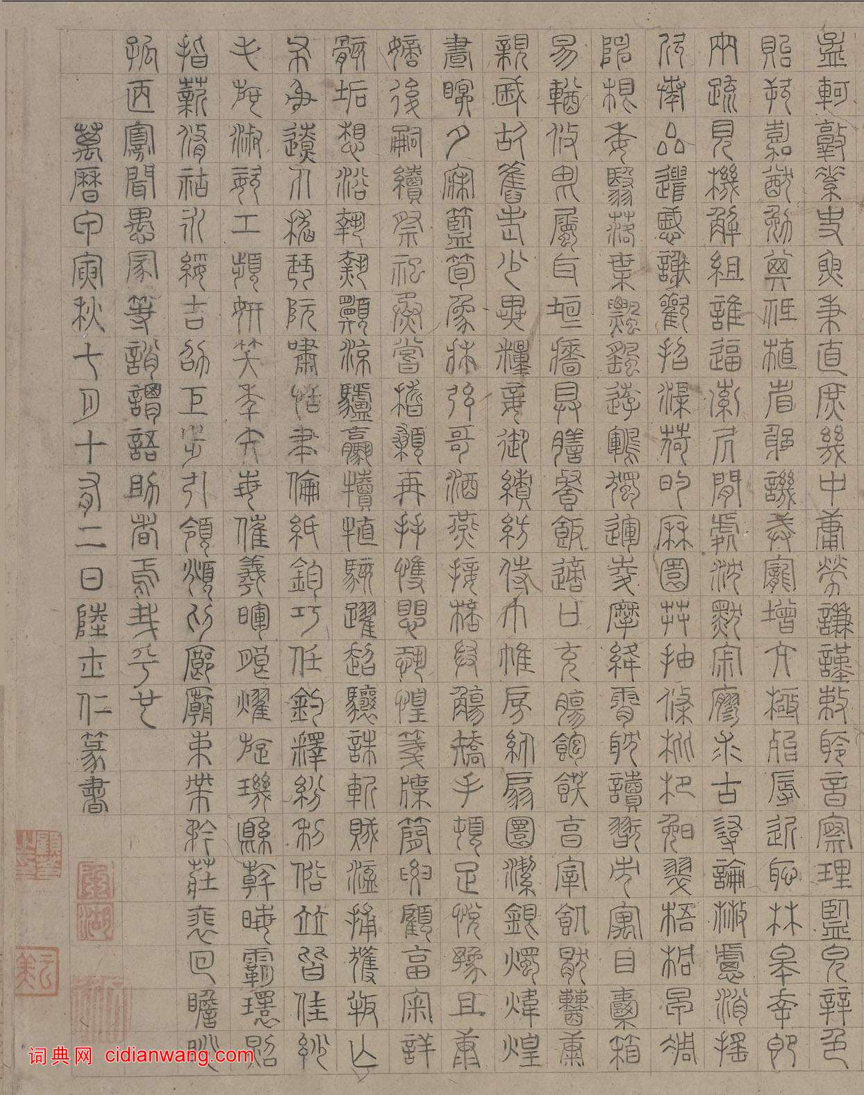 資源下載魏晉書法唐朝書法宋朝書法元朝書法明朝書法清朝書法近現代書法字典網>> 歷代書法>> 明朝>> 陸士仁《四體千字文》卷(2)正文 陸士仁《四體千字文》卷(2)作者:陸士仁 書體:四體 本卷篆書於1614年秋書成,款署“萬曆甲寅秋七月十有二日,陸士仁篆書”,鈐“承湖”、“文近”印2方。首 頁 上一頁 1 2 3 4 5 6 下一頁 尾 頁 全文2018-6-23 13:14:54 相關文章:倪元璐《草書蘇軾七律詩扇面》 (草書)倪元璐《草書蘇軾七律詩扇面》 泥金紙本草書,北京故宮博物院藏釋文:可憐擾擾雪中人...《聖教序》書法集字春聯快過年了,小編為大家準備了《聖教序》書法集字春聯供大家參考:陶淵明草書《擬古九首帖》 (草書)陶淵明《擬古九首帖》節選該內容為陶淵明《擬古九首帖》拓本。縱觀整件作品,通篇用筆...張浚行書《談笑措置帖》 (行書)張浚《談笑措置帖》紙本行書 31.5×38.2cm 北京故宮博物院藏釋文:浚再...戰國《包山楚簡》 (篆體)戰國中晚期 湖北荊門包山楚簡 湖北省博物館藏(下為局部) 1986年湖北荊門市包...黃道周行草《洗心詩卷》 (行草)黃道周《洗心詩卷》 行草,台北故宮博物院藏,來自上海書畫出版社出版《書法自學叢帖...米芾行書《褚遂良摹蘭亭序跋贊》 (行書)米芾《褚遂良摹蘭亭序跋贊》 紙本 24 X 47.5cm 北京故宮博物院藏。 釋...東漢隸書《裴岑紀功碑》 (隸書)《裴岑紀功碑》東漢碑刻,全稱《漢敦煌太守裴岑紀功碑》,順帝永和二年(137)立於...楊嘉祚·跋虞世南《摹蘭亭序》 (草書)楊嘉祚跋虞世南《摹蘭亭序》,縱24.5厘米。現藏於北京故宮博物院。文徵明·行書卷 (行書)文徵明《行書卷》,絹本,39.4×565.7厘米。廣東省博物館藏。