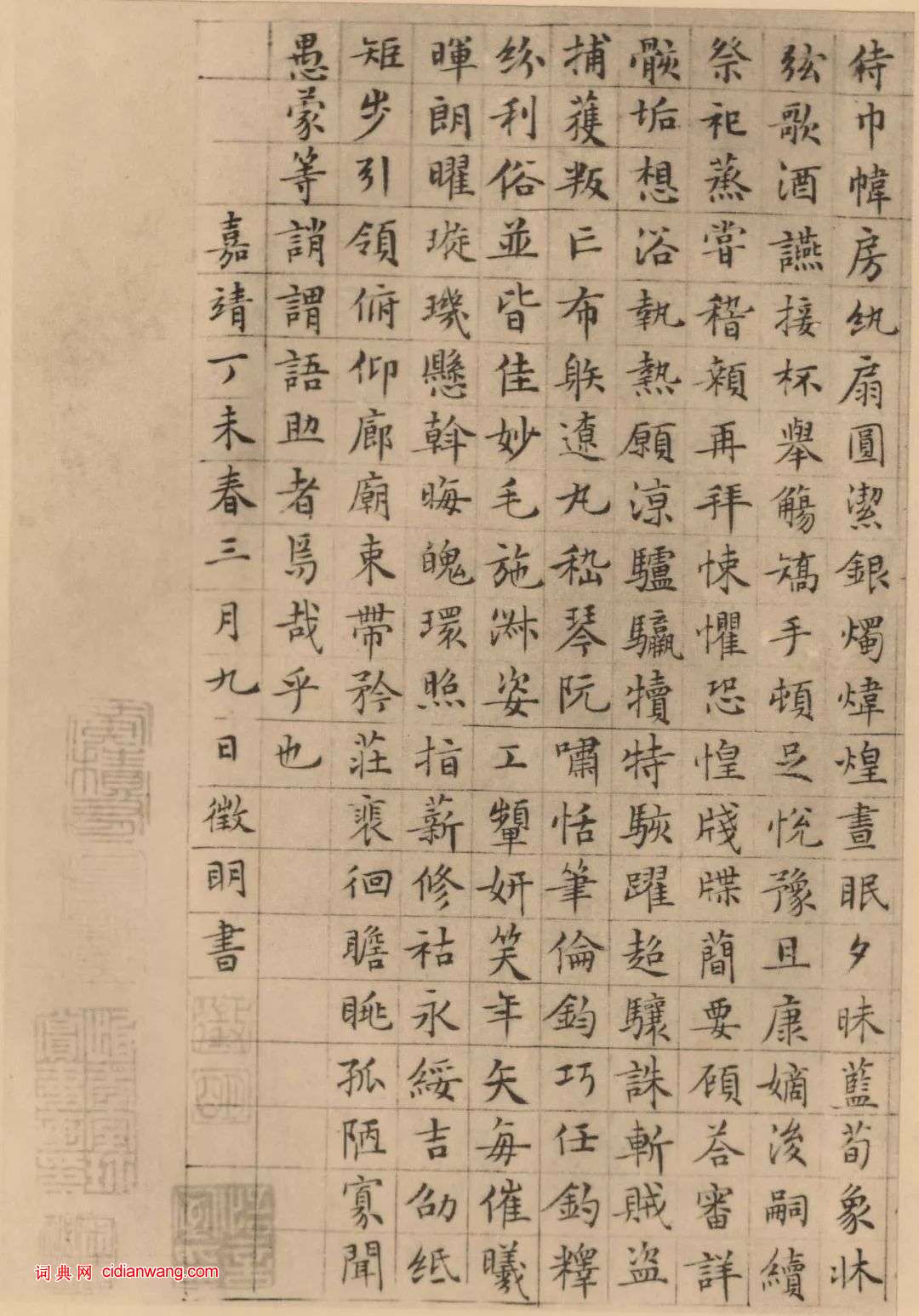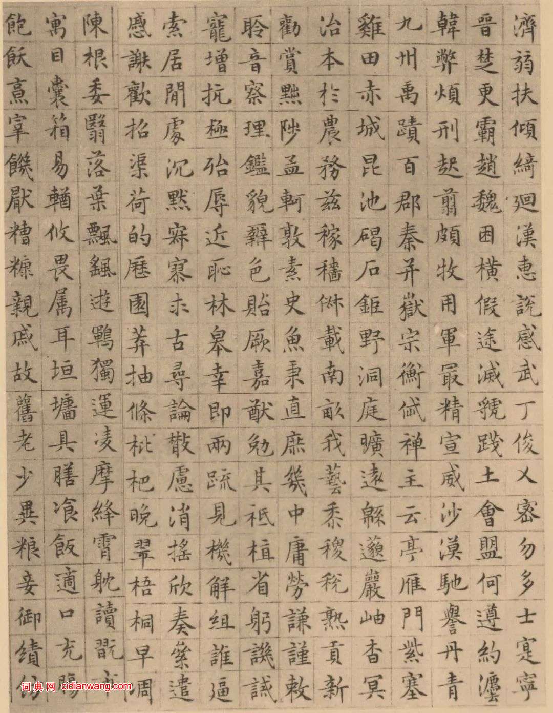 資源下載魏晉書法唐朝書法宋朝書法元朝書法明朝書法清朝書法近現代書法字典網>> 歷代書法>> 明朝>> 文徵明《四體千字文》(2)正文 文徵明《四體千字文》(2)作者:文徵明 書體:四體 首 頁 上一頁 1 2 3 4 5 6 7 8 下一頁 尾 頁 全文2018-6-24 8:17:26 文徵明的相關書法作品:文徵明《行書午門朝見詩》 文徵明大字行書《題宋高宗賜岳飛手敕》 文徵明行書《樂志論》 文徵明小楷《千字文》 文徵明行書《明妃曲》 文徵明《行書阿房宮賦》 冊頁 文徵明行書 《剡藤湘竹七言詩軸》 文徵明草書《湖光披素練詩卷》 文徵明行書《離騷》 相關文章:何紹基楷書《安得壯哉七言聯》 (楷書)何紹基《楷書“安得壯哉”七言聯》紙本楷書 337×51.3cm×2 道光...湯賓尹《般若波羅蜜多心經》 (行書)湯賓尹《般若波羅蜜多心經》,行書,縱33.7cm。書於吳彬《十六羅漢圖卷》後,美...林散之《行草自作荊溪二首詩軸》 (行草)林散之《行草自作荊溪二首詩軸》 137×33cm 1963年 馬鞍山林散之藝...趙抃楷書《山藥帖》 (楷書)趙抃《山藥帖》紙本楷書 27.3×24.8cm 至和元年(1054)台北故宮博...朱熹行書《二月十一日帖》 (行書)宋 朱熹《二月十一日帖》,行書【釋文】二月十一日熹頓首再拜上記德修宮使、直閣左史...歐陽修·灼艾帖 (行書)【釋文】修啟,多日不相見,誠以區區。見發言,曾灼艾,不知體中如何?來日修偶在家,...王羲之《都下帖》 (草書)《都下帖》,傳王羲之書,麻紙摹本,縱27.7厘米。現藏台北故宮博物院。五行半,四...張雨《跋周伯琦宮學國史二箴卷》 (行書)張雨《跋周伯琦宮學國史二箴卷》,在周伯琦篆書《宮學國史二箴卷》後,紙本,縱26厘...孫星衍·篆書八言聯 (篆書)孫星衍《篆書八言聯》,紙本,縱131.9厘米,橫29.2厘米。上海博物館藏。文徵明《草書詩卷》 (草書)文徵明草書詩卷 紙本 縱29.5厘米,橫133.4厘米。無錫市博物館藏釋文:“山...