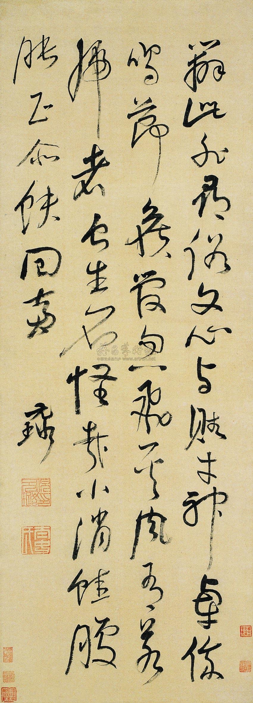 倪元璐《草書“辨此非尋俗”詩軸》 絹本草書 120×43cm 北京翰海2002年秋拍賣 858號拍品 釋文:辨此非尋俗,文心與賦才。神卓俄鳴節,矦管忽飛灰。風有若歸者,蟲生不怪哉。小消蛙腹脹,正■蚨回兼。