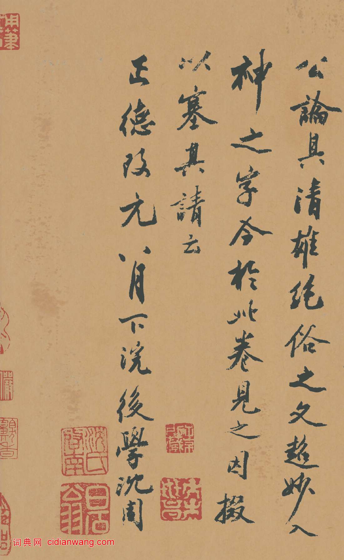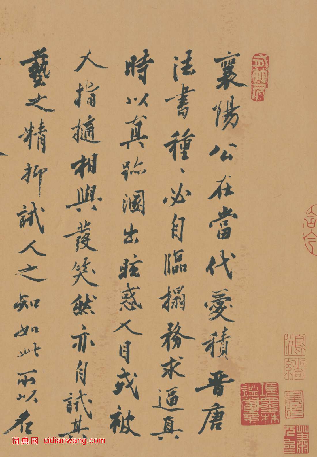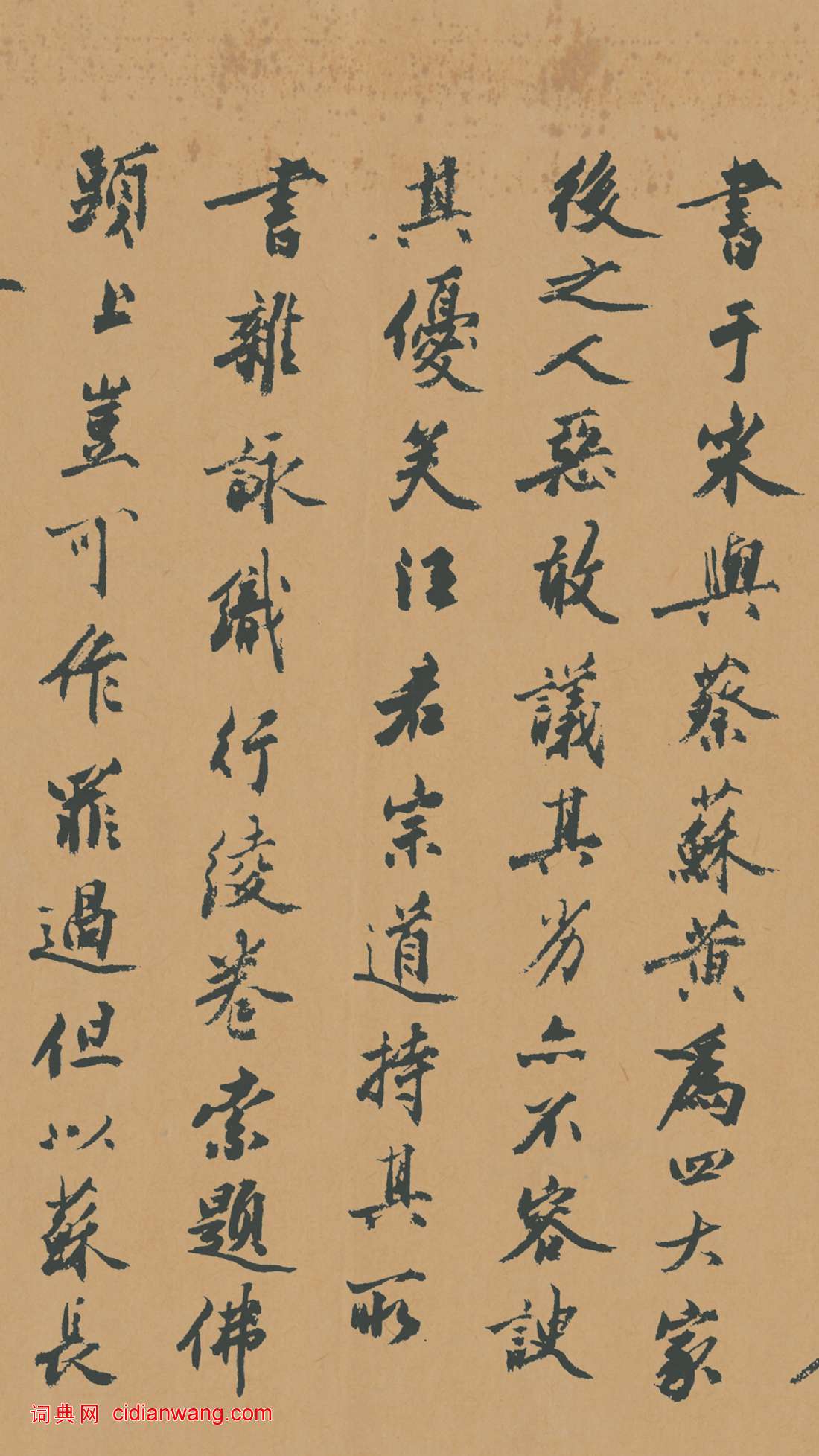 釋文:襄陽公在當代。愛積晉唐法書。種種必自臨搨。務求逼真。時以真跡溷出。眩惑人目。或被人指擿。相與發笑。然亦自試其藝之精。抑試人之知。如此所以名書。於宋與蔡蘇黃為四大家。後之人。惡敢議其劣。亦不容諛其優矣。汪君宗道持其所書雜詠織行綾卷索題。佛頭上豈可作罪過。但以蘇長公論其清雄絕俗之文。超妙入神之字。今於此卷見之。因掇以塞其請雲。