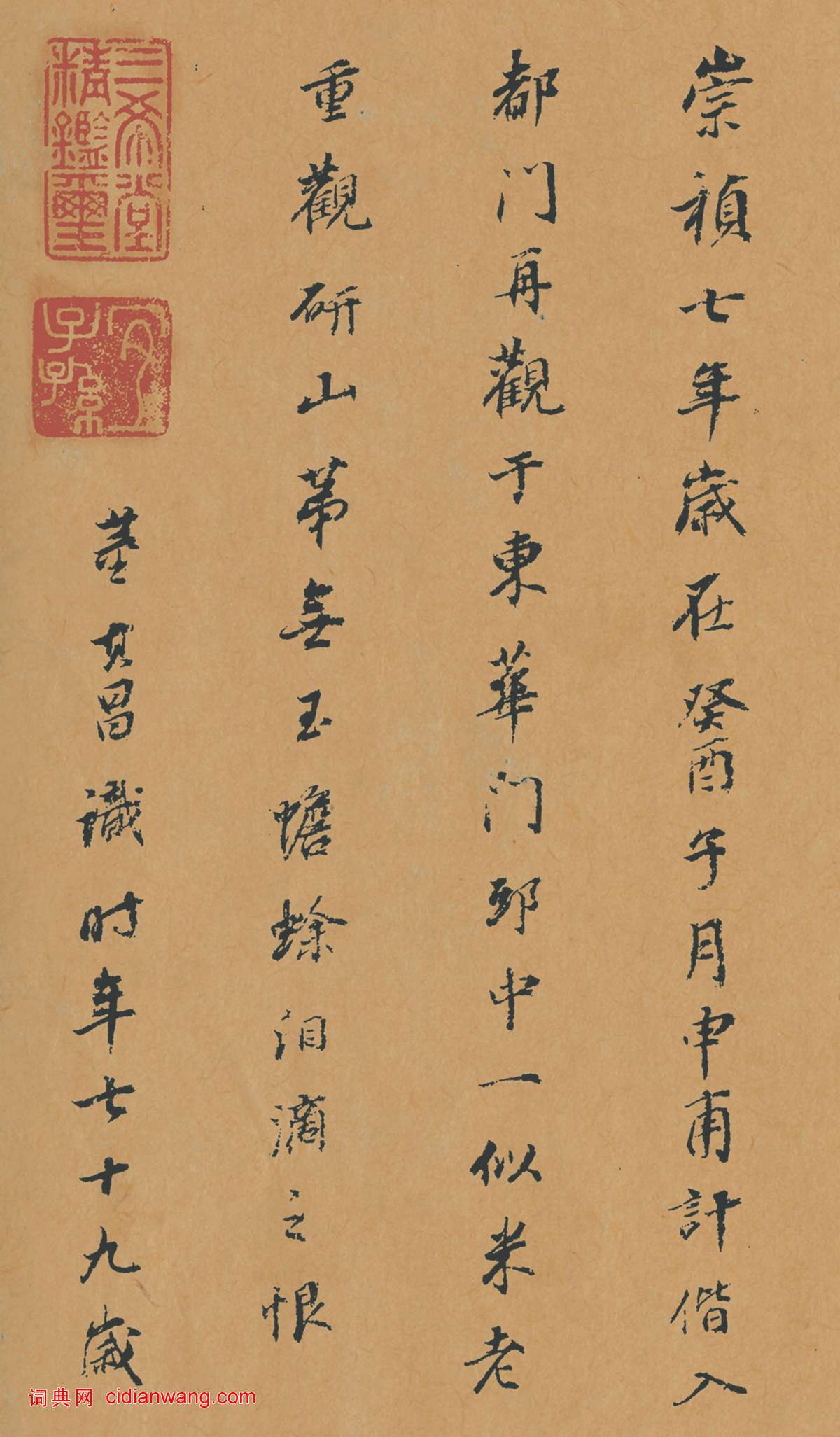 釋文:崇禎七年(1634)。歲在癸酉(1633)子月。申甫計偕入都門。再觀於東華門邸中。一似米老重觀研山。第無玉蟾蜍淚滴之恨。董其昌識。時年七十九歲。