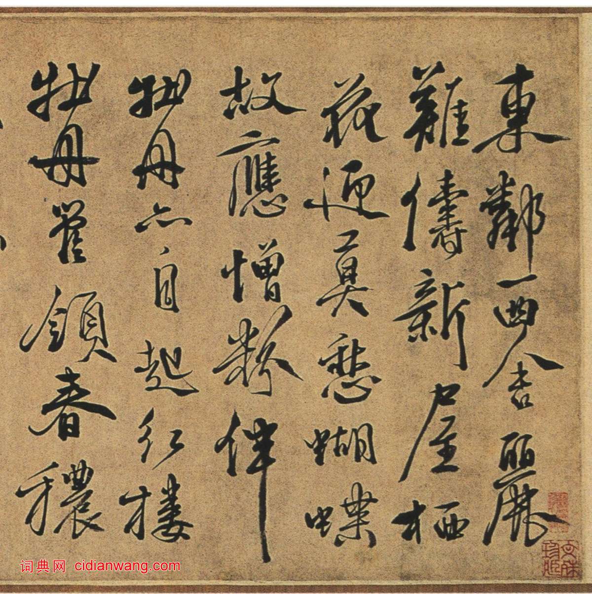 該書作融入了米芾、黃庭堅的筆法體勢,筆勢圓渾沉著,縱橫奔放,不拘法度;書體古拙而姿媚,形散而神不散。雖然該書作沒有那種草書的疾風暴雨之勢,但仍能感受到通篇行筆的迅疾。