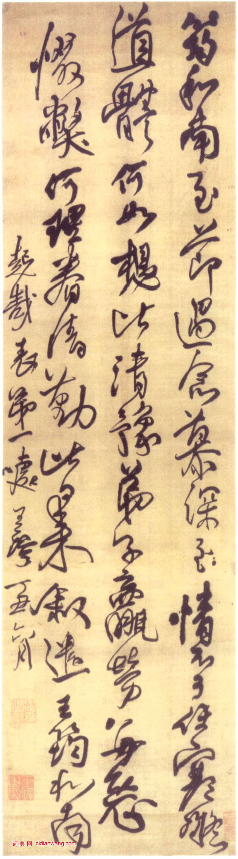 王鐸《臨王筠帖》行書軸,186.8X50.7厘米,綾本,書於明崇禎十年(丁丑1637年),上海博物館藏