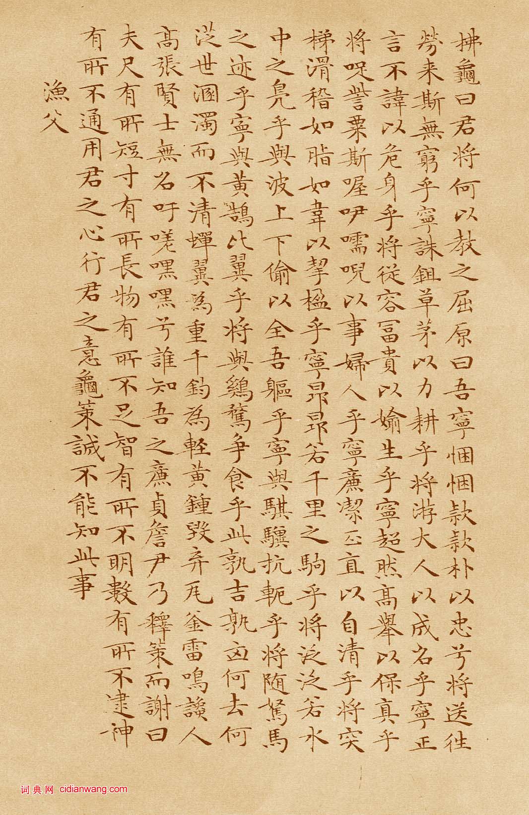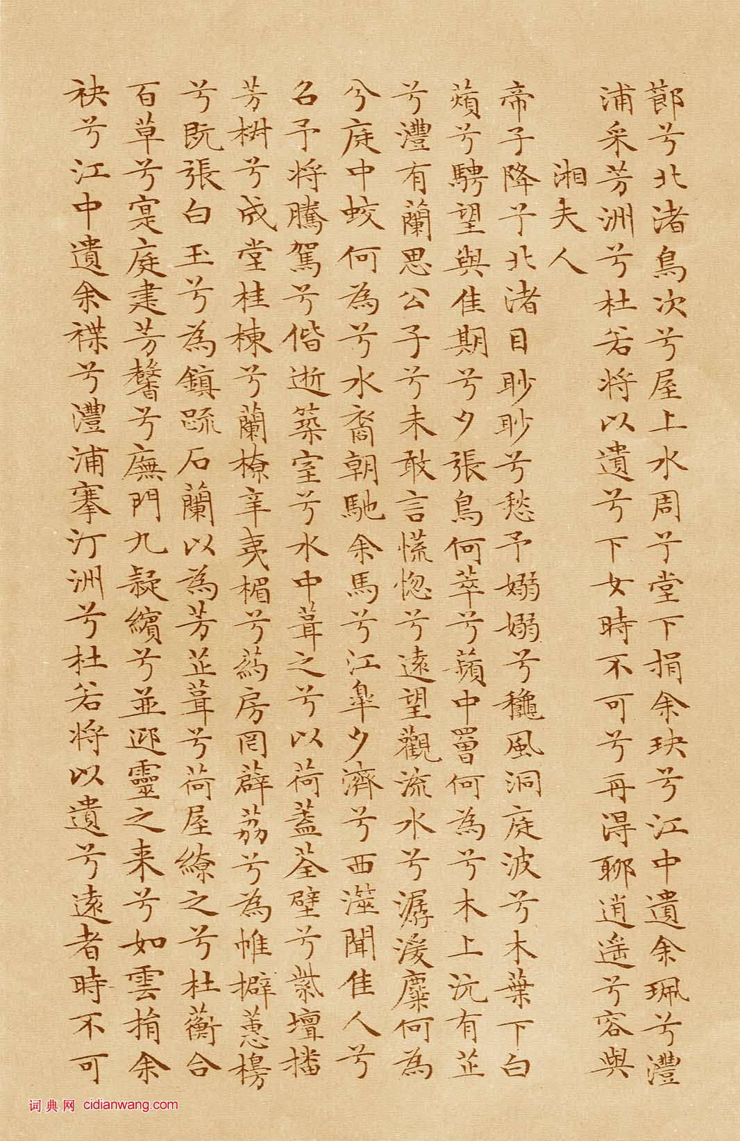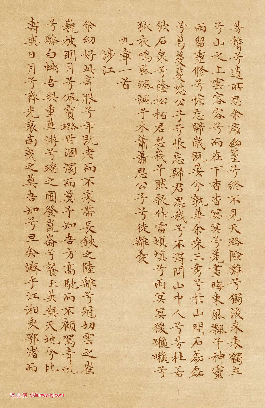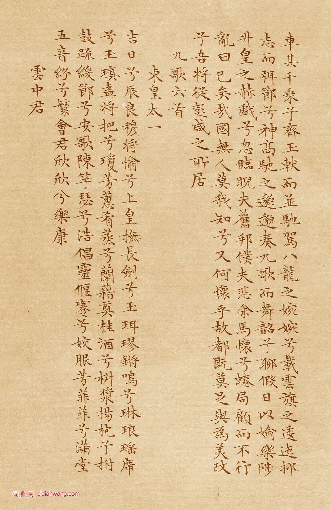 文徵明小楷《離騷經九歌卷》,書於明嘉靖乙卯年(1555年),時年文徵明85歲,書寫了《離騷經》《東皇太一》《雲中君》《湘君》《湘夫人》《司命》《山鬼》《涉江》《卜居》《漁父》等,每部分均有標題。末有文徵明自己之題識。