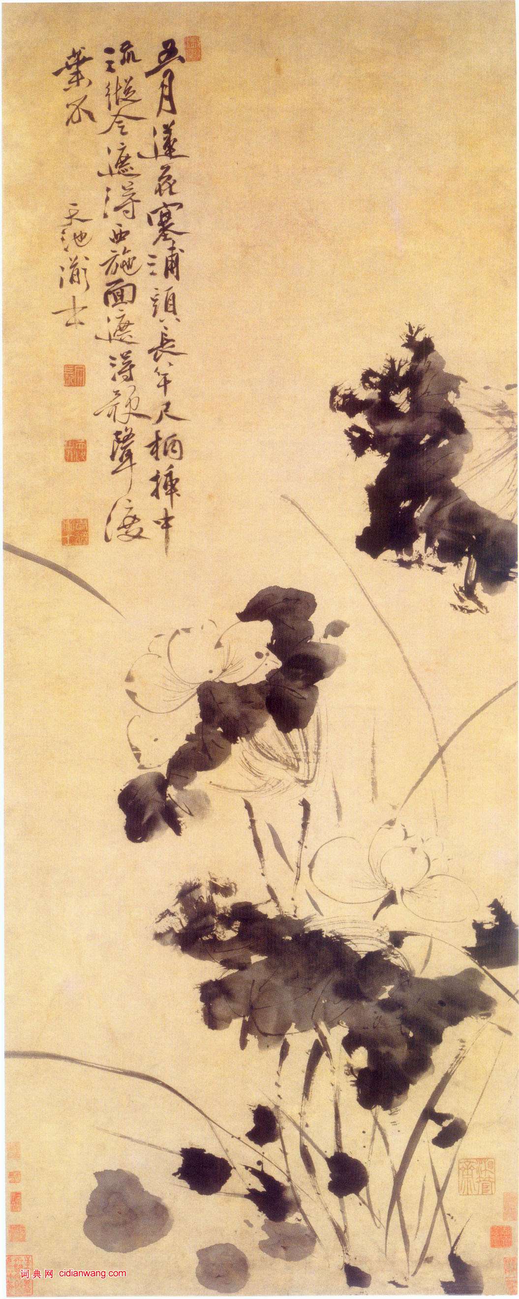 明 徐渭《五月蓮花圖》, 紙本,水墨,尺寸: 103 x51cm, 徐渭37歲時的作品,上海博物館藏。