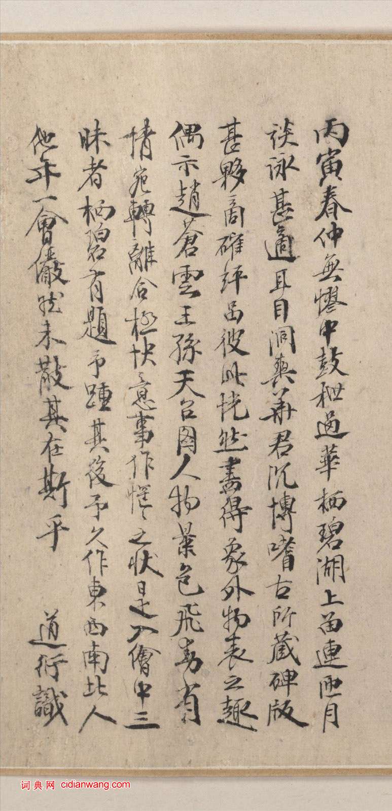 丙寅春仲無憀中鼓枻過華棲碧湖上,留連匝月,談詠甚適,耳目洞爽。華君沉博嗜古,所藏碑版甚伙。商確評品,彼此恍然,盡得象外物表之趣。偶示趙蒼雲王孫《天台圖》,人物景色飛動有情,宛轉離合,極快意事,作懌懌之狀,是入繪中三昧者。棲碧有題,予踵其後。予久作東西南北人,他年一會儼然未散,其在斯乎?