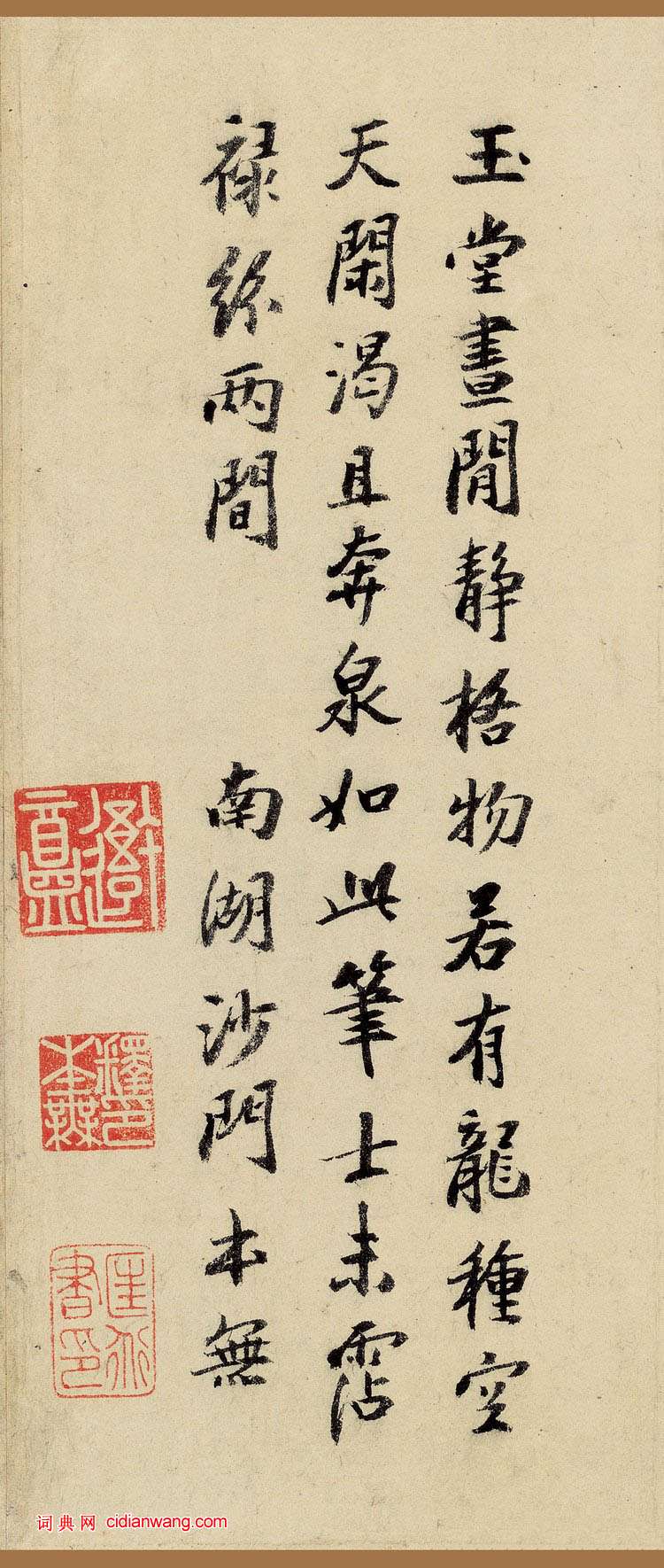 資源下載魏晉書法唐朝書法宋朝書法元朝書法明朝書法清朝書法近現代書法字典網>> 歷代書法>> 明朝>> 本無行書題《趙孟頫飲馬圖卷》正文 本無行書題《趙孟頫飲馬圖卷》作者:本無 書體:行書 本無題《趙孟頫飲馬圖卷》,行書,紙本,遼寧省博物館藏。釋文:玉堂畫閒靜格物,若有龍種空天閒。渴且奔泉如此筆,士未霑祿紛兩間。南湖沙門本無。2019-1-3 18:52:50 相關文章:奚岡《隸書傅玄席銘橫幅》 (隸書)奚岡《隸書傅玄席銘橫幅》紙本隸書 114×150cm 安徽省博物館藏款署:鶴渚...何紹基行書《詠落花七律十五章》 (行書)何紹基行書《詠落花七律十五章》:同治四年乙丑(一八六五)春天,何紹基(1799-...黃庭堅行書《致景道十七使君札》 (行書)黃庭堅行書《致景道十七使君書》,紙本。信札一則,縱27.8厘米,橫47.4厘米。...寫好硬筆書法的19個訣竅寫好硬筆字19個訣竅推薦給硬筆書友參考:老舍·華世奎 《南皮張氏兩烈女碑》拓片提字 (楷書)釋文:華世奎字璧臣祖籍江蘇無錫世居天津自幼勤學三十歲中舉同年步入仕途出任內閣閣丞...沈尹默行書《鮑照白雲詩軸》 (行書)沈尹默《行書鮑照白雲詩軸》紙本行書 102×25cm 常州博物館藏 釋文:探靈...宋克章草《急就章》 (章草)宋克-章草急就章,宋克(1327-1387),字仲溫,號南宮生。長洲(今江蘇吳縣...王鐸行書《春過長春寺》立軸 (行書)王鐸《春過長春寺》立軸 行書 綾本,書於清順治四年(丁亥1647年), 23...康里巎巎跋《任仁發張果老見明皇圖卷》 (行書)康里巎巎 跋《任仁發張果老見明皇圖卷》 絹本 縱41.5cm 北京故宮博物院藏任...倪瓚題《水竹居圖軸》 (小楷)倪瓚《水竹居圖軸》 紙本設色 縱53.5厘米 橫28.2厘米 中國國家博物館藏倪...