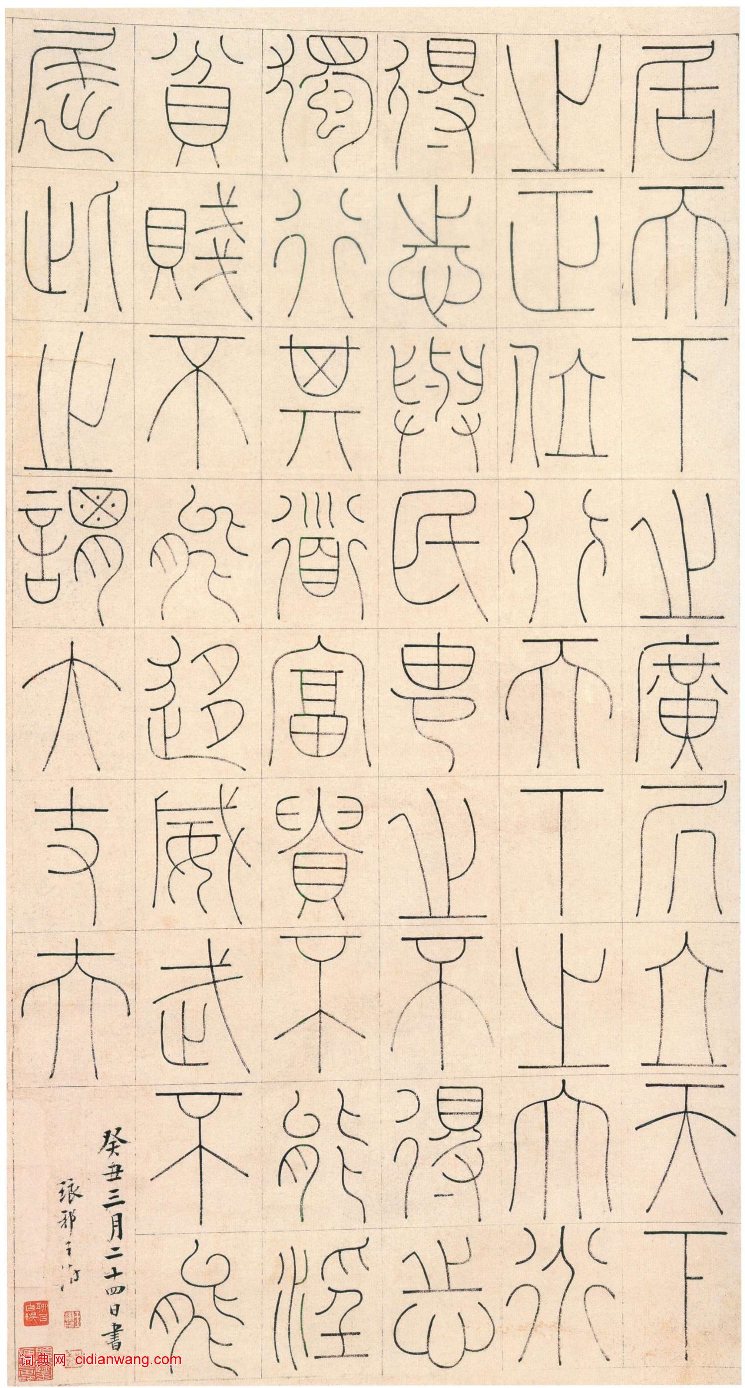 是軸字型規正,運筆勁健,風格俊逸,為玉筋篆體的佳作。此軸書於“癸丑三月”,鈐“王澍印”、 “恭壽”兩印。癸丑為雍正十一年(1733),作者時年六十五歲。