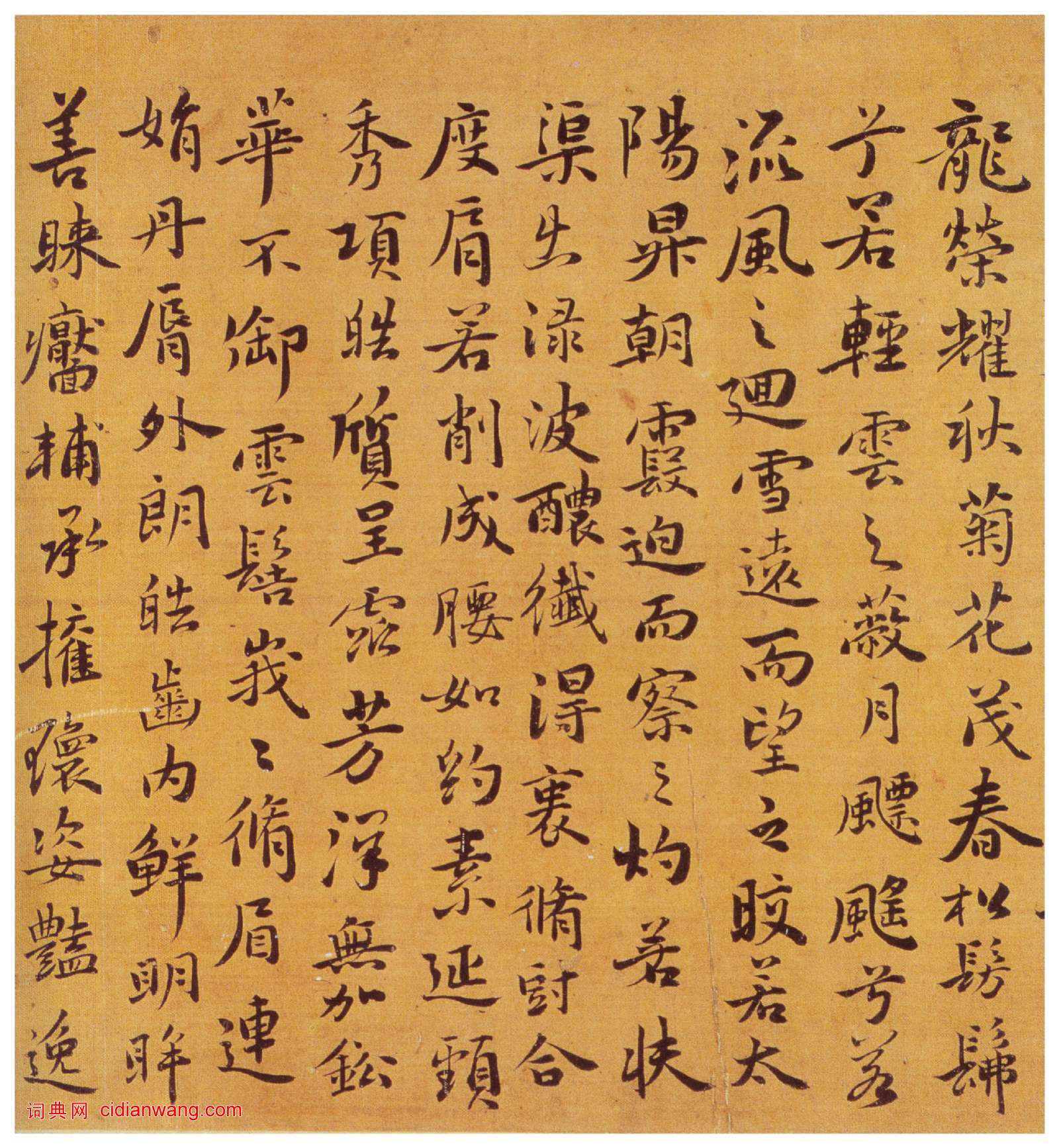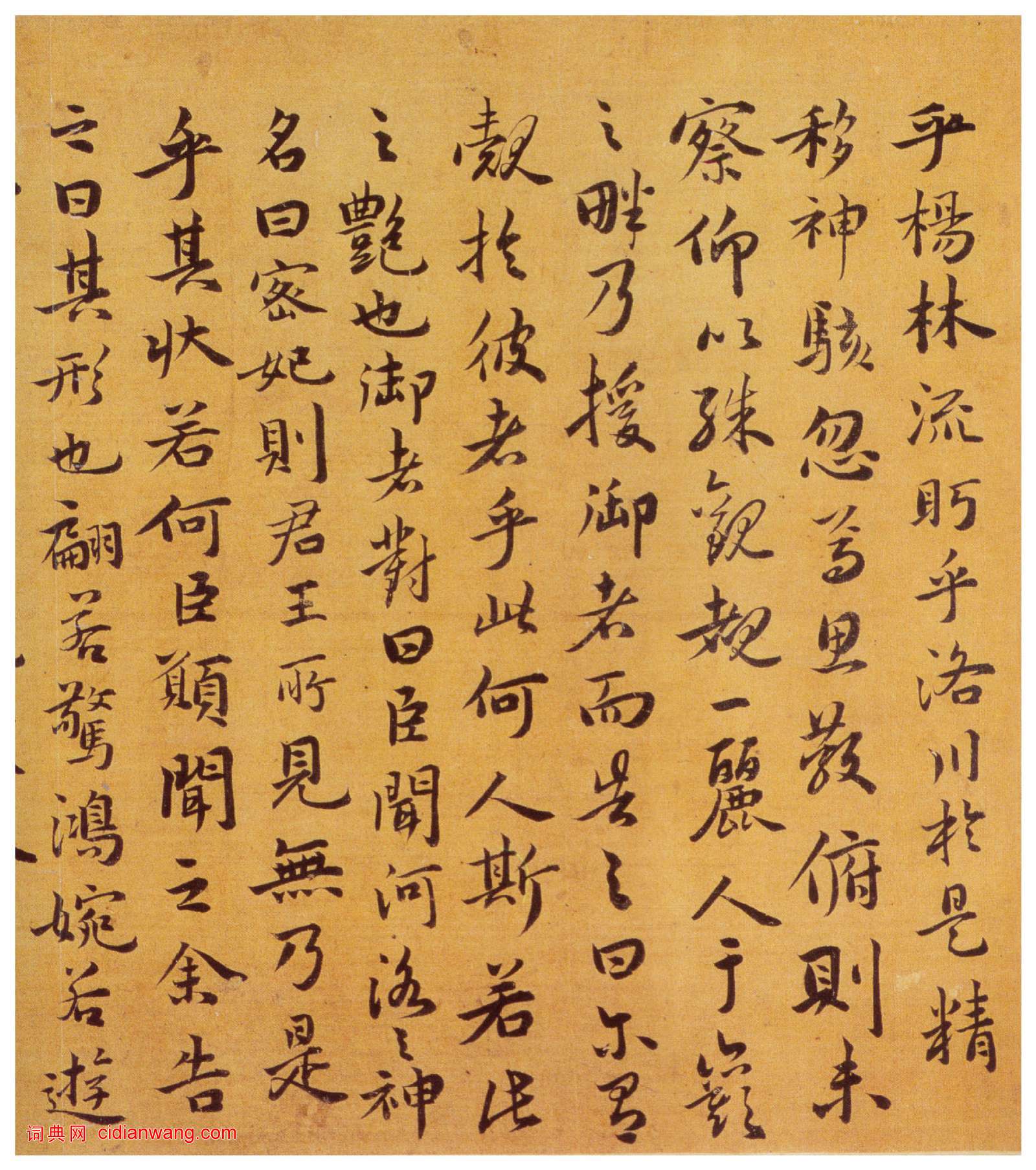 這裡所刊《祝允明行楷洛神賦》卷,絹本,長161厘米,高20.1厘米,為朵雲軒藏本。跋者斷為祝四十歲左右師古之作,有一定道理。觀其點畫、結體,《蘭亭》意味極濃,又有鍾法存乎其間,淳厚典雅,參以趙孟頫,然變化多致;其行筆從容不迫,筆筆到位,一派君子之風。此類前賢師古之作對我們今天學書法者極有借鑑價值。