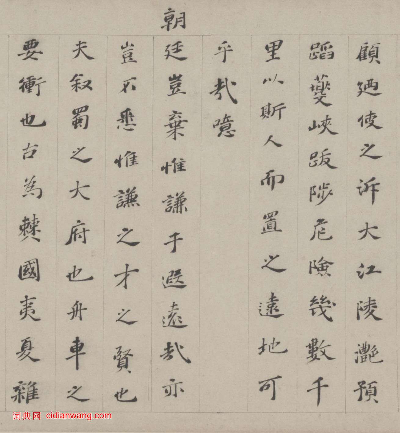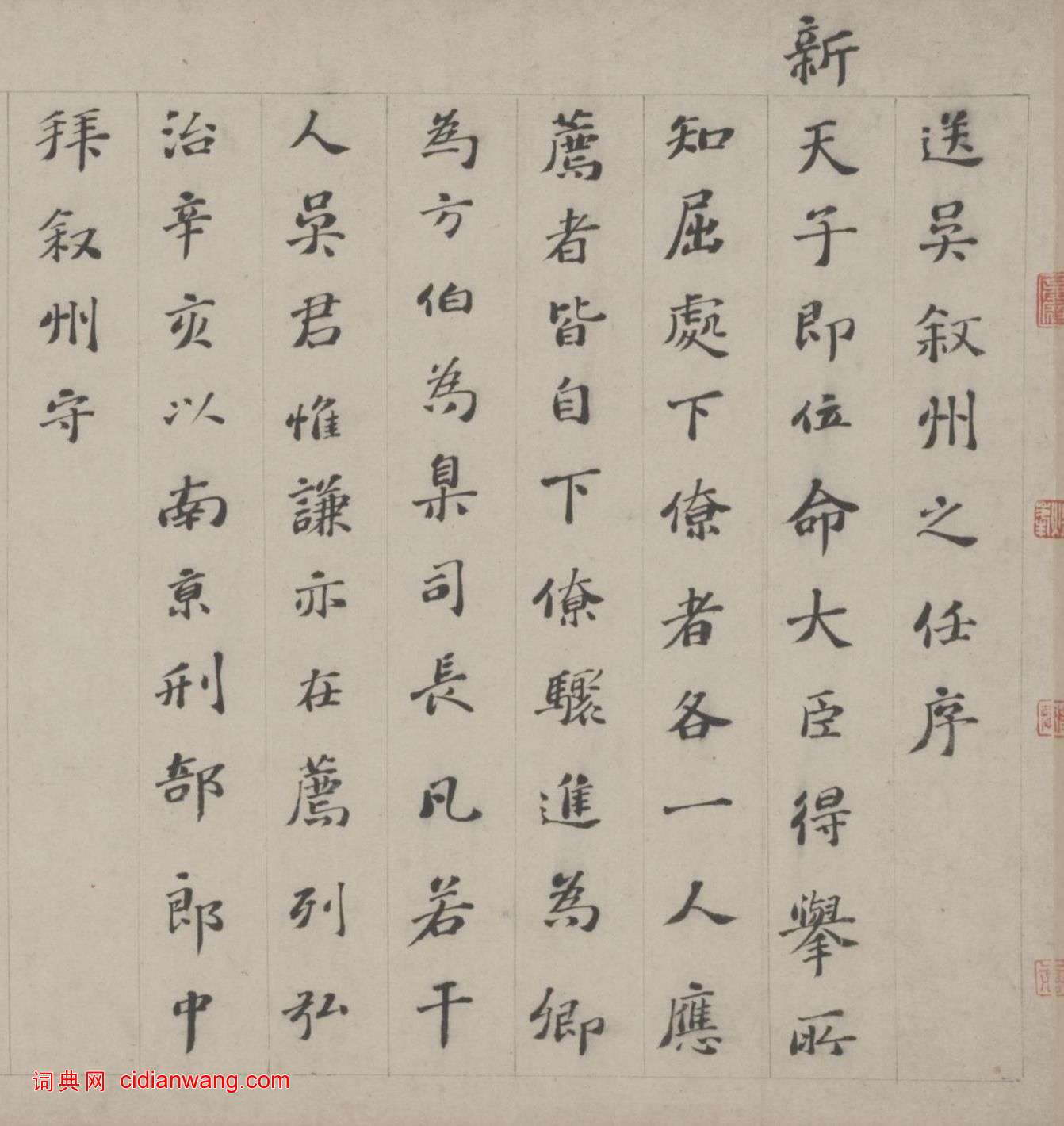 文林楷書《送吳敘州之任序》,明,文徵明之父,明弘治五年(1492年)題於沈周《京江送別圖卷》後,紙本,縱28cm,北京故宮博物院藏。