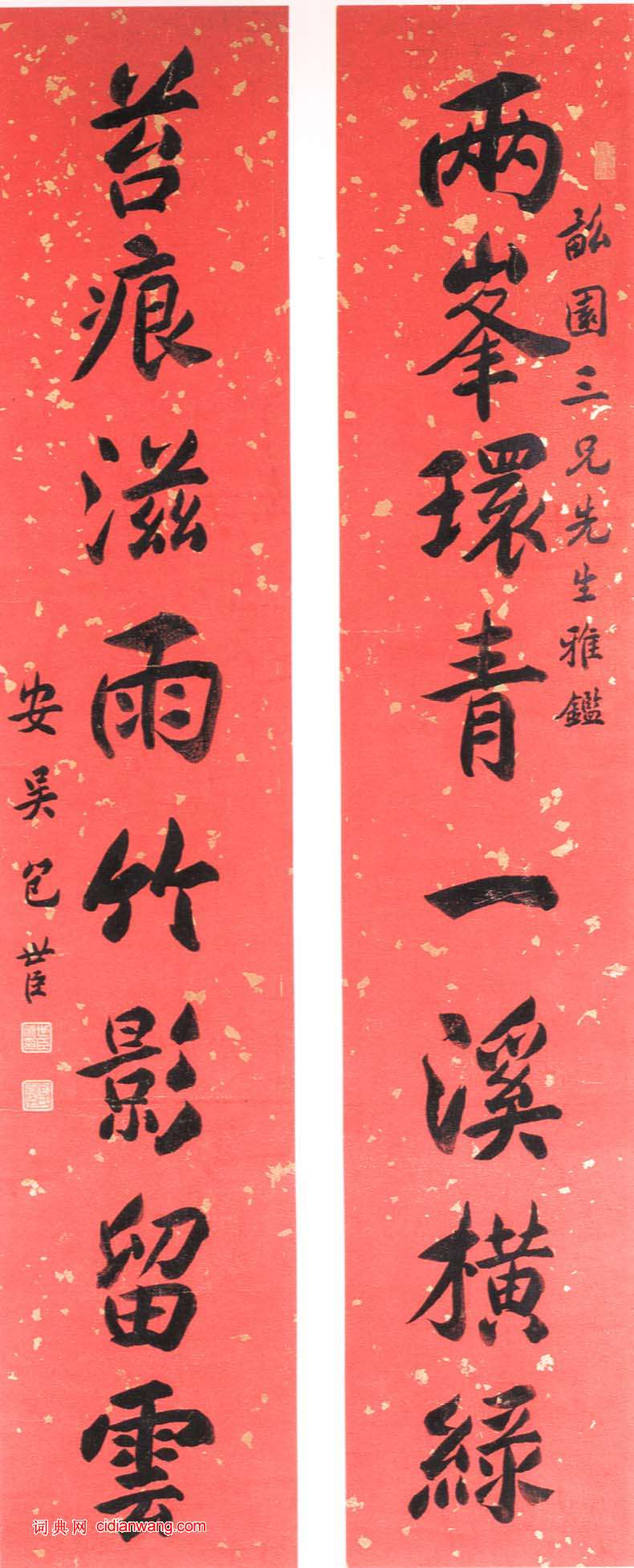 書法欣賞魏晉書法唐朝書法宋朝書法元朝書法明朝書法清朝書法近現代書法字典網>> 歷代書法>> 明朝>> 包世臣行書《雨峰苔痕八言聯》正文 包世臣行書《雨峰苔痕八言聯》作者:包世臣 書體:行書 包世臣行書八言聯釋文:雨峰環青一溪橫綠,苔痕滋雨竹影留雲。畝圓三兄先生雅鑒,安吳包世臣2019-2-5 18:49:56 包世臣的相關書法作品:包世臣《行書論書軸》 包世臣行書《好書嘉樹七言聯》 包世臣《節臨張旭秋深帖》 包世臣《贈矩亭楷書四條屏》 包世臣《行書玉笈瓦當八言聯》 包世臣《行書松濤法文題辭屏四條屏》 包世臣草書《節臨書譜軸》 包世臣草書《春暉準平八言聯》 包世臣楷書《贈與九楷書軸》 相關文章:于右任楷書《致盈星先生書》 (楷書)于右任《致盈星先生書》,錄自王維七言詩《夷門歌》釋文:七雄雄雌猶未分,攻城殺將何...陳鴻壽《隸書五言聯》 (隸書)釋文:閒中有富貴,壽外更康寧。陳鴻壽中國清代篆刻家。字子恭,號曼生、曼龔、曼公、...徐渭《行草立軸》 (行草)徐渭 行草立軸 紙本 123×35cm來自中國嘉德2005四季第2期拍賣會 ...吳琚《行書五段卷》 (行書)吳琚《行書五段卷》28.7×63.8cm 上海博物館藏(劉靖基捐贈)吳琚《行書...傅山《草書祝錫予六十壽十二條屏》軸 (草書)傅山《草書祝錫予六十壽十二條屏》軸 綾本 200×51.5cm×12 山西省...高二適行草《致章士釗蘭亭論辯手稿》 (行草)高二適《致章士釗“蘭亭論辯”手稿》 1965 28cmX134cm 高二適紀念...于右任《草書無極顯仁五言聯》 (草書)于右任《草書無極顯仁五言聯》資料不詳釋文:無極原有極,顯仁存至仁。 款署:於...趙孟頫小楷《無逸》 (小楷)趙孟頫小楷《無逸》,現藏故宮博物院。《無逸》沒有年款,原帖與(1301)蕭 (奭...陳獻章草書《種蓖麻詩卷》 (草書)陳獻章《種蓖麻詩卷》 紙本草書 25.3x428cm 廣東省博物館藏釋文:種蓖麻...包世臣《行書論書軸》 (行書)包世臣《行書論書軸》,色箋,行書,尺寸:134×30.5cm,安徽省博物館藏。...