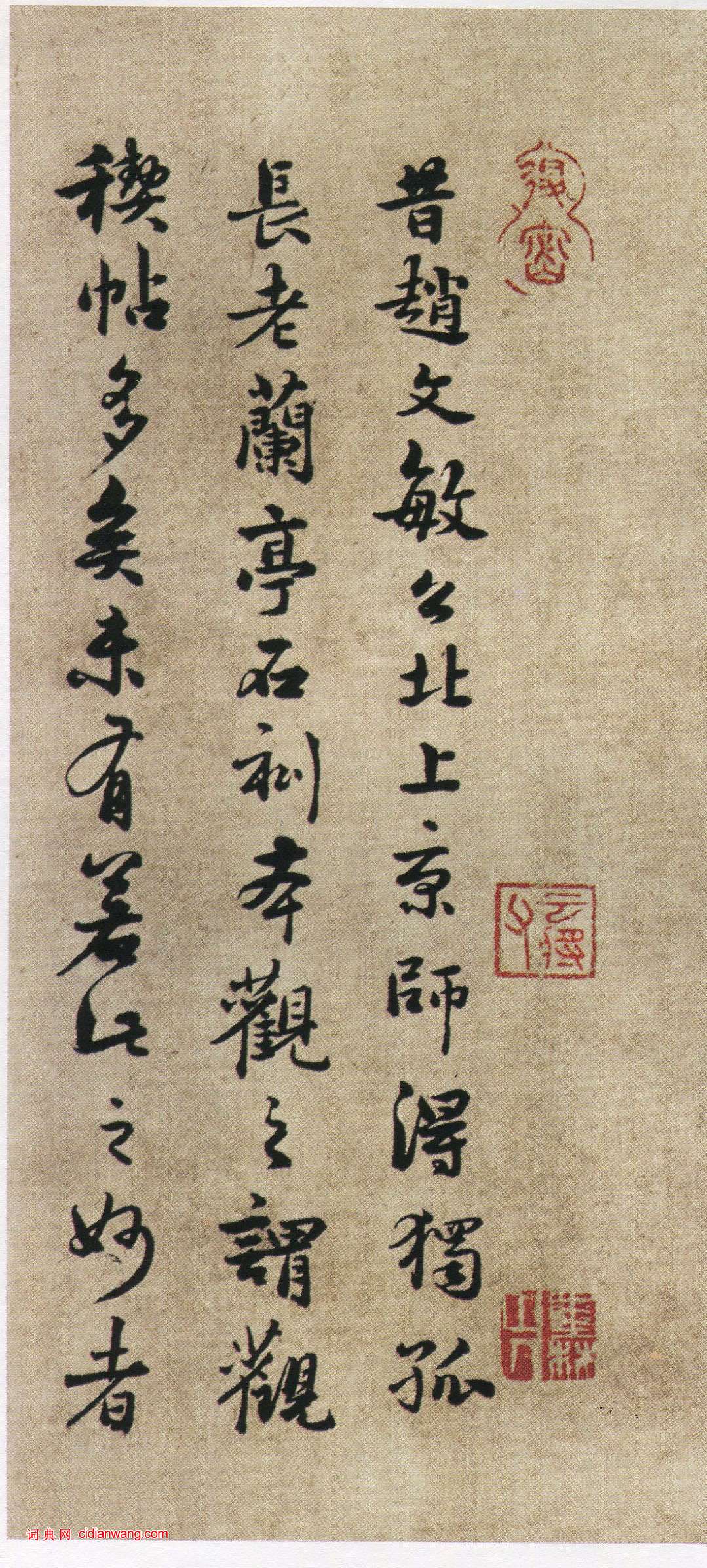 昔趙文敏公北上京師得獨孤長老蘭亭石刻本,觀之謂觀稧帖多矣,未有若此之妙者,求其用筆之意乃為有益,蓋真書法者,一見瞭然。翰林陳編修家藏褚遂良所臨蘭亭墨本,千百年下,寶而名之,豈易得也哉,此又重於文敏公之得獨孤本也...