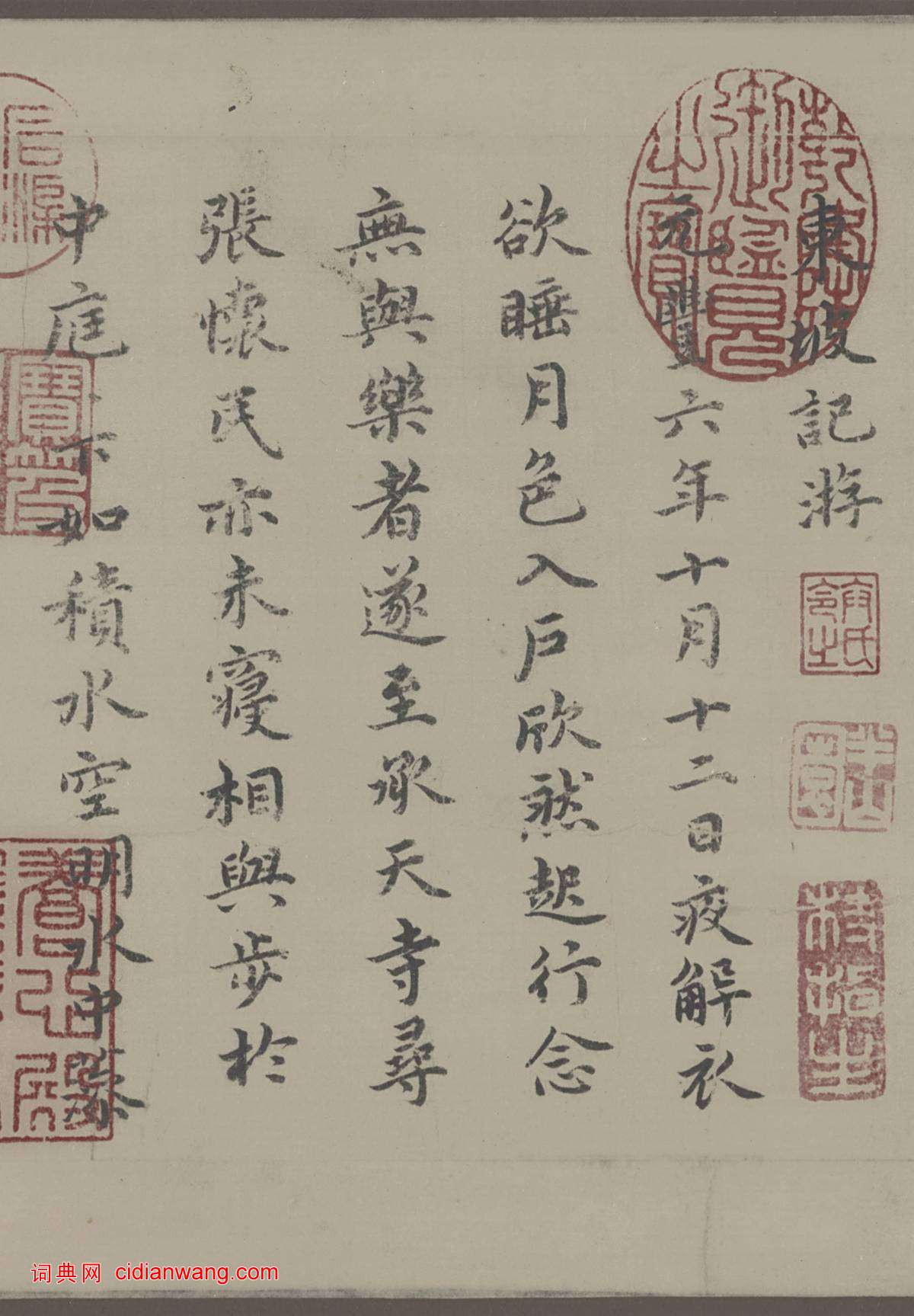 元豐六年十月十二日夜,解衣欲睡,月色入戶,欣然起行。念無與為樂者,遂至承天寺尋張懷民。懷民亦未寢,相與步於中庭。庭下如積水空明,水中藻荇交橫,蓋竹柏影也。何夜無月?何處無竹柏?但少閒人如吾兩人者耳。