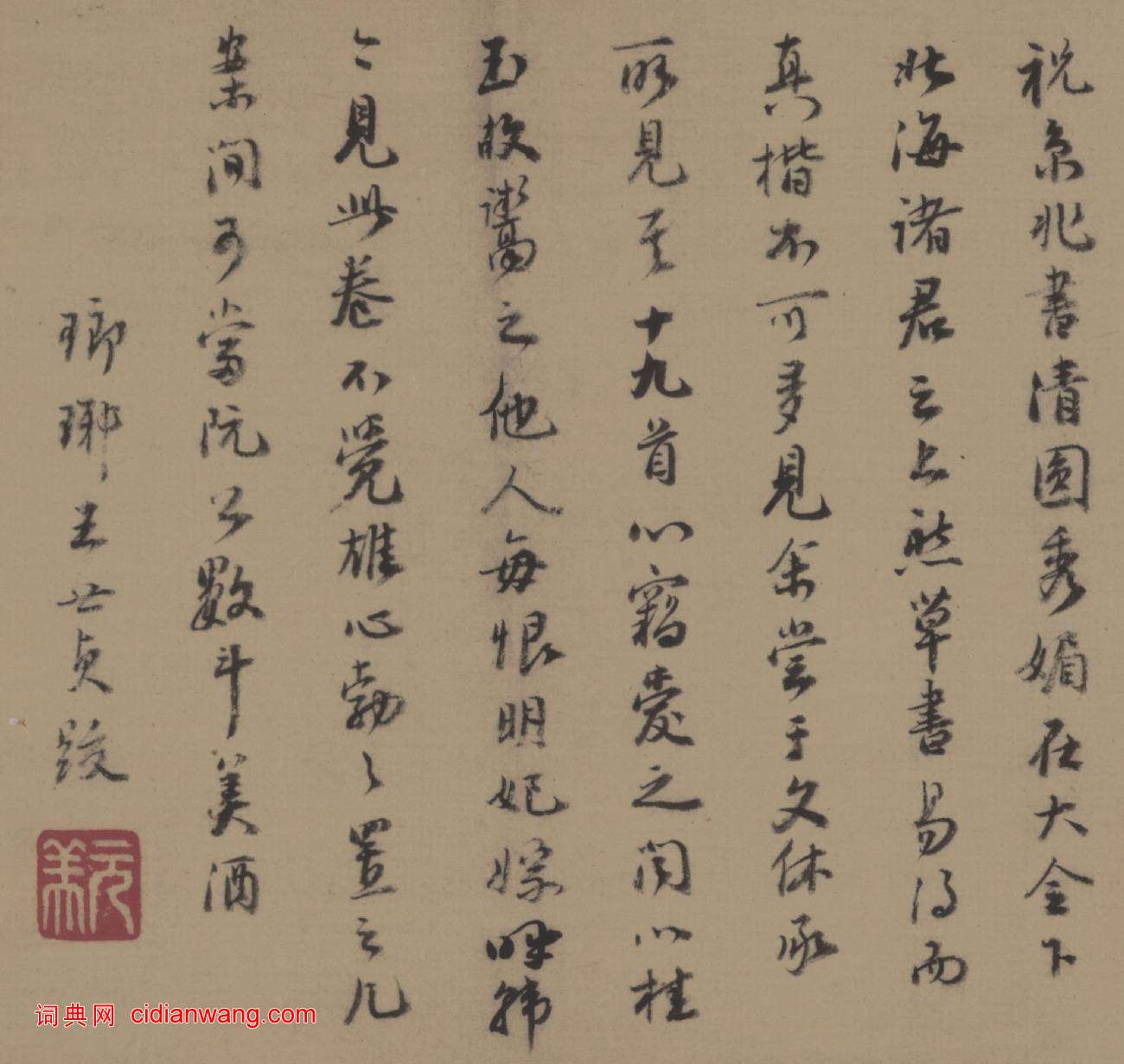 祝京兆書清圓秀媚,在大令下北海諸君之上,然草書易得而真楷不可多見。余嘗於文體承所見至十九首,心竊愛之,閹以桂玉故鬻之他人。每恨明妃嫁呼韓。今見此卷不覺雄心勃勃,置之几案間,可當阮公數斗美酒。