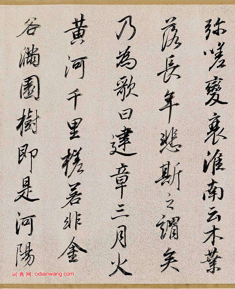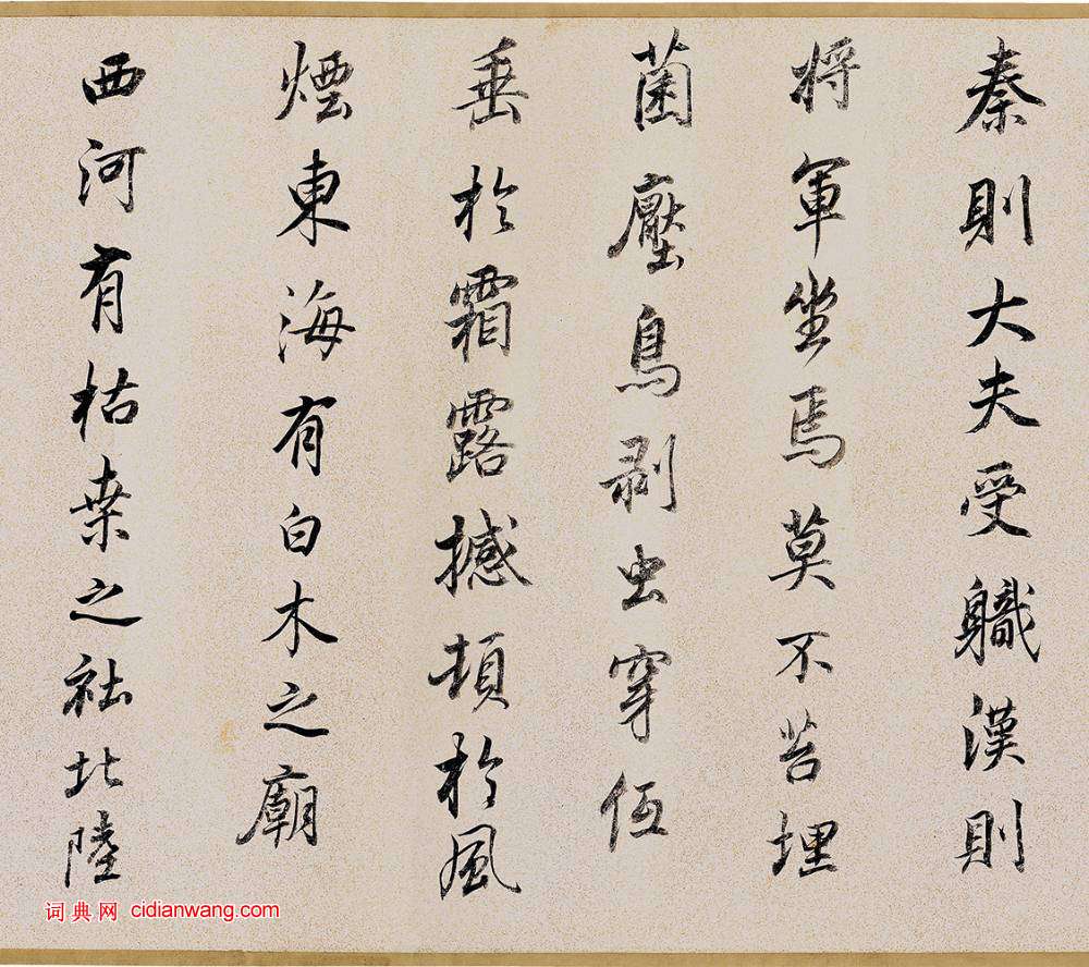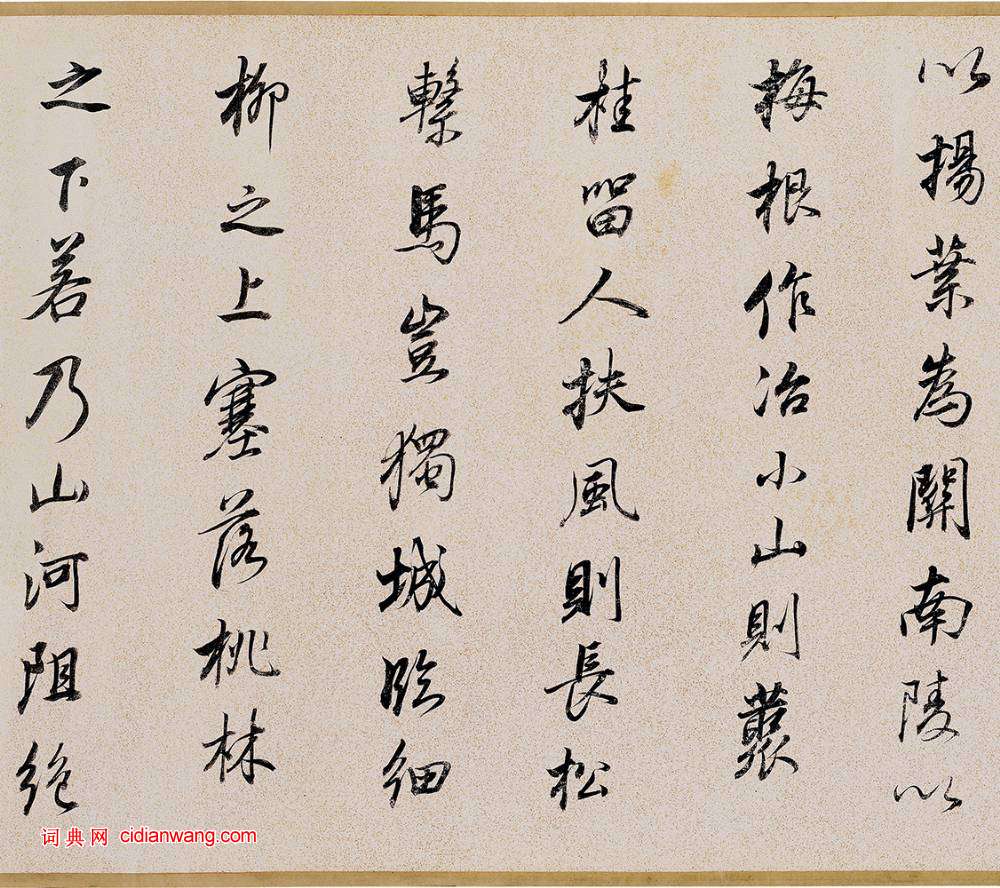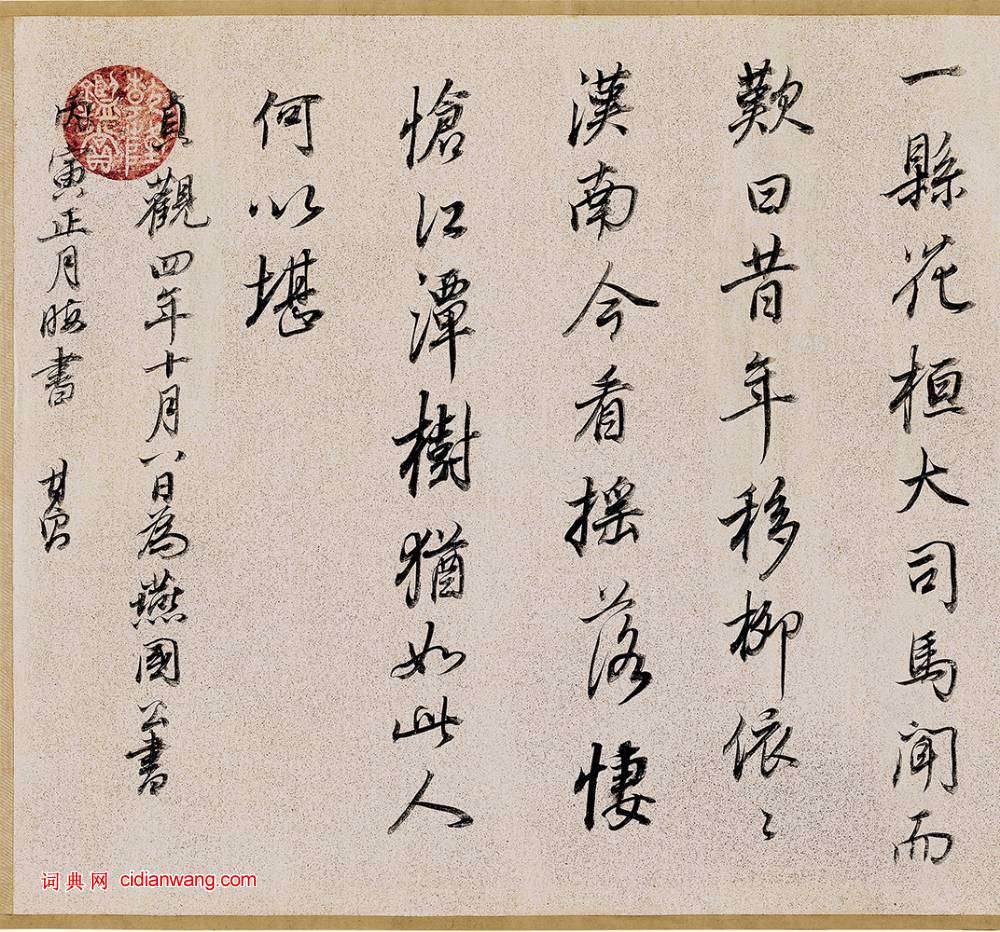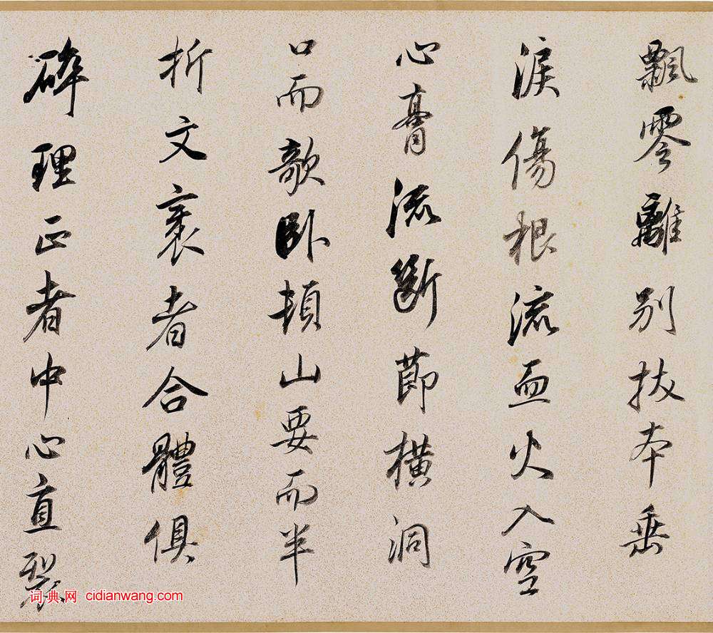 褚遂良為“初唐四家”之一,其《枯樹賦》為630年所書,原跡不存,僅有刻本傳世,《聽雨樓帖》所刻尤精。董其昌刻《戲鴻堂帖》亦收。此卷用灑金箋臨,書於1626年,董氏72歲。雖為臨書,但自家筆意時有流露,結體疏朗,氣脈貫暢。開始筆勢柔緩,溫雅自如,進而漸趨迅疾,連綿相屬。褚書勁挺腴潤、搖曳多姿,美如瑤台嬋娟,對董氏書風影響頗大。董氏於褚書《褚摹蘭亭》《文皇哀冊》等無不廣泛學習。