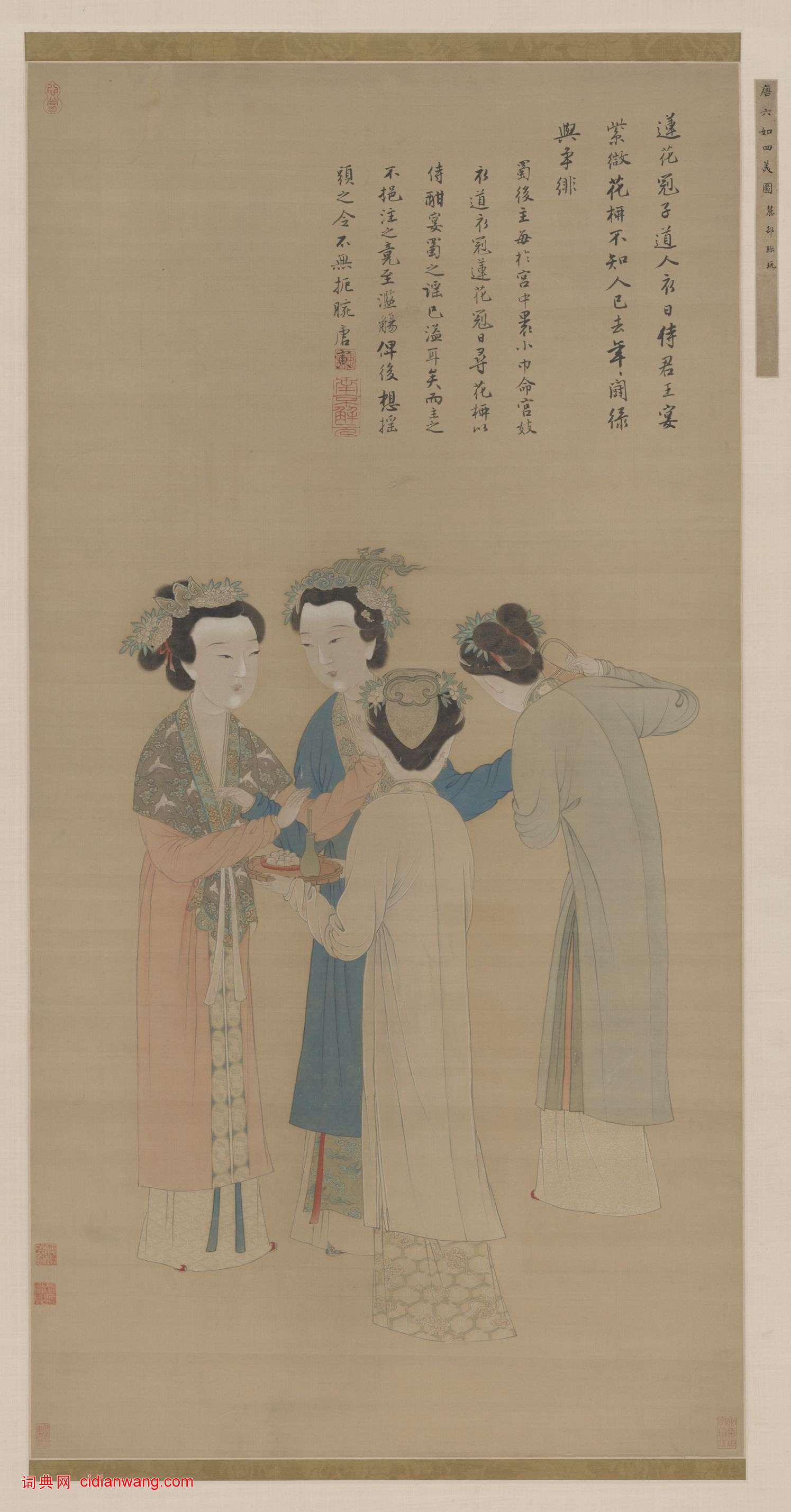 此圖原名《孟蜀宮妓圖》,俗稱《四美圖》,由明末汪砢玉《珊瑚網·畫錄》最早定名,沿用至今。近經專文考證,當改為《王蜀宮妓圖》,描繪的是五代前蜀後主王衍的後宮故事。畫面四個歌舞宮女正在整妝待君王召喚侍奉。她們頭戴金蓮花冠,身著雲霞彩飾的道衣,面施胭脂,體貌豐潤中不失娟秀,情態端莊而又嬌媚。蜀後主王衍曾自製“甘州曲”歌,形容著道衣的宮妓嫵媚之態:“畫羅裙,能結束,稱腰身。柳眉桃臉不勝春,薄媚足精神。可惜許,淪落在風塵。”唐寅創作此畫,則旨主揭示前蜀後主王衍荒淫腐敗的生活,寓有鮮明的諷喻之意。