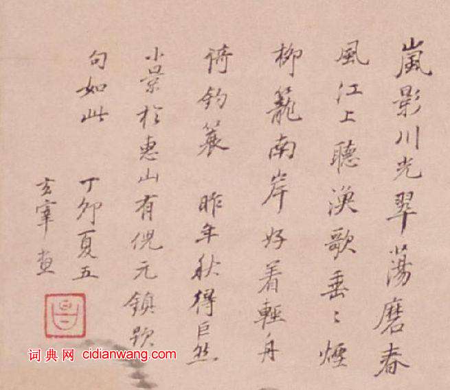 本幅自題:“嵐影川光翠盪磨,春風江上聽漁歌。垂垂煙柳籠南岸,好著輕舟倚釣蓑。昨年秋得巨然小景於惠山,有倪元鎮題句如此。丁卯夏五。玄宰畫。” 鈐印“昌”。