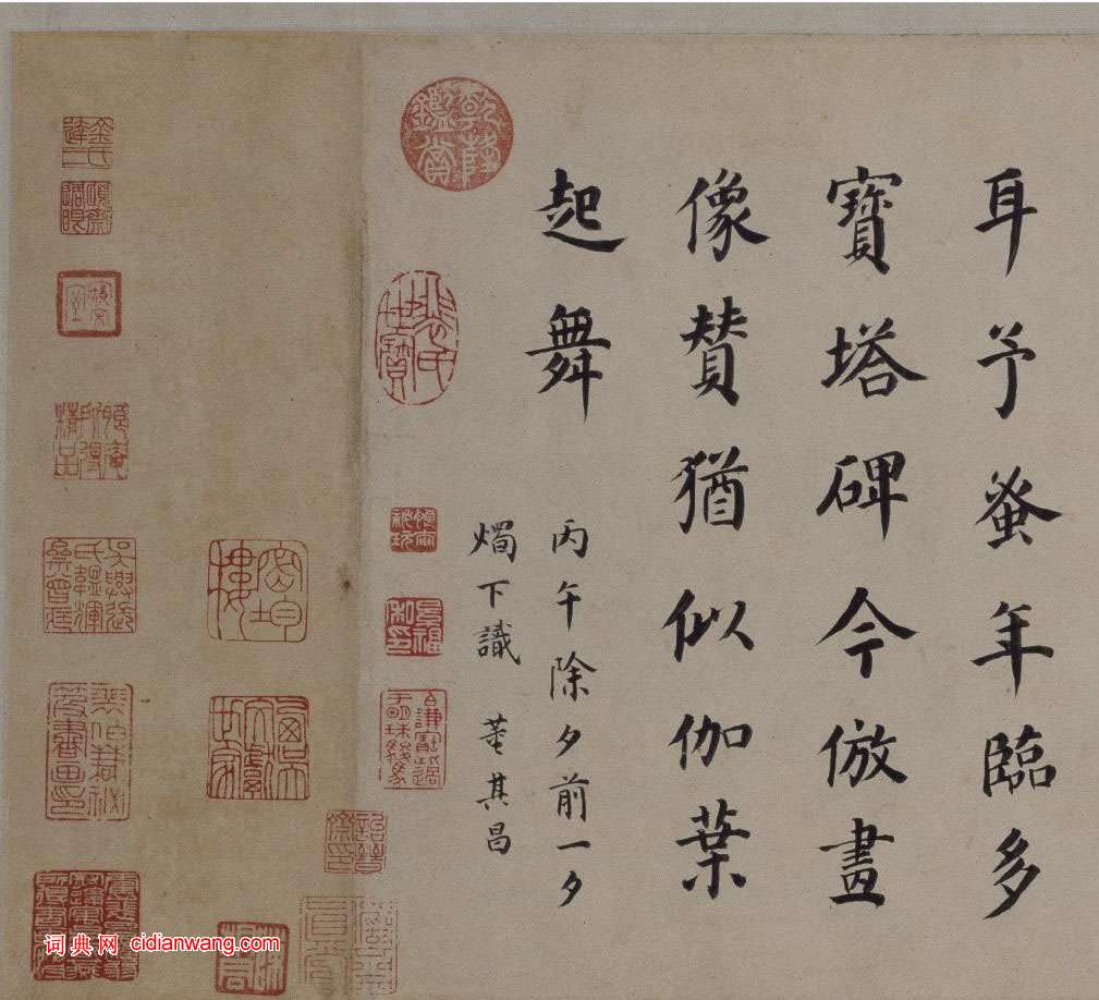 卷末自識:“顏尚書此碑,蘇學士書所自出。世謂蘇學徐浩音者,乃行楷一種耳。予蚤年臨《多寶塔碑》,今仿《畫像贊》,猶似伽葉起舞。丙午除夕前一夕燈下識。董其昌。”卷前引首四字:“參指頭禪”。卷後有近人宋伯魯、裴景福、華盦道士李玉梅、沈尹默等四家題跋。鑑藏印鈐“乾隆御覽之寶”、“三希堂精鑒璽”、“石渠寶笈”等28方。