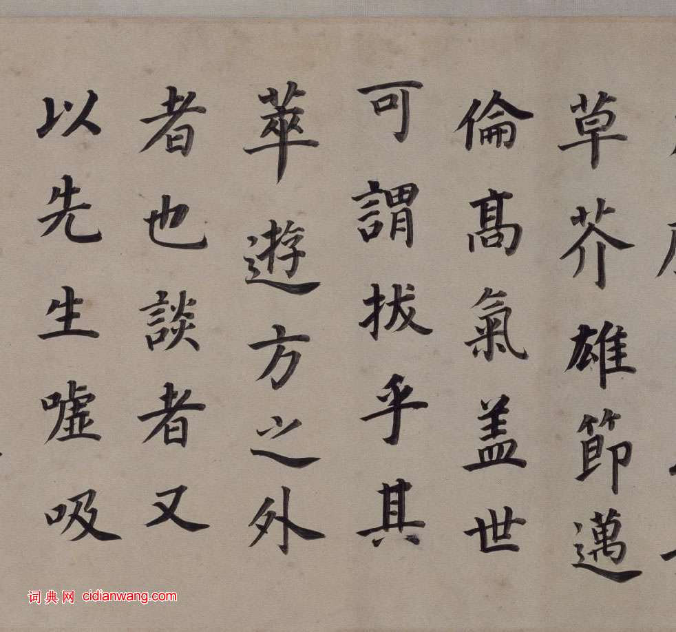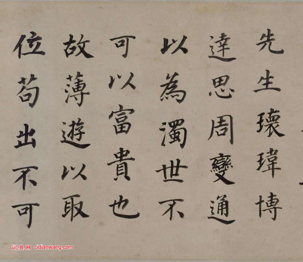 先生環瑋博達,思周變通。以為濁世不可以富貴也,故薄游以取位。苟出不可以直道也,故頡頏以傲世;傲世不可以垂訓也,故正諫以明節。明節不可以久安也,故詼諧以取容。潔其道而穢其跡,清其質而濁其文。弛張而不為邪,進退而不離群。若乃遠心曠度,贍智宏材。倜儻博物,觸類多能。合變以明筭,幽贊以知來。自《三墳》、《五典》、《八索》、《九丘》,陰陽圖緯之學,百家眾流之論。周給敏捷之辯,支離覆逆之數。經脈藥石之藝,射御書計之術。乃研精而究其理,不習而盡其功。經目而諷於口,過耳而 於心。夫其明濟開豁,包含弘大,凌轢卿相,嘲哂豪桀,籠罩靡前,跆籍貴勢。出不休顯,賤不憂戚,戲萬乘若寮友,視儔列如草芥。雄節邁倫,高氣蓋世,可謂拔乎其萃,遊方之外者已。