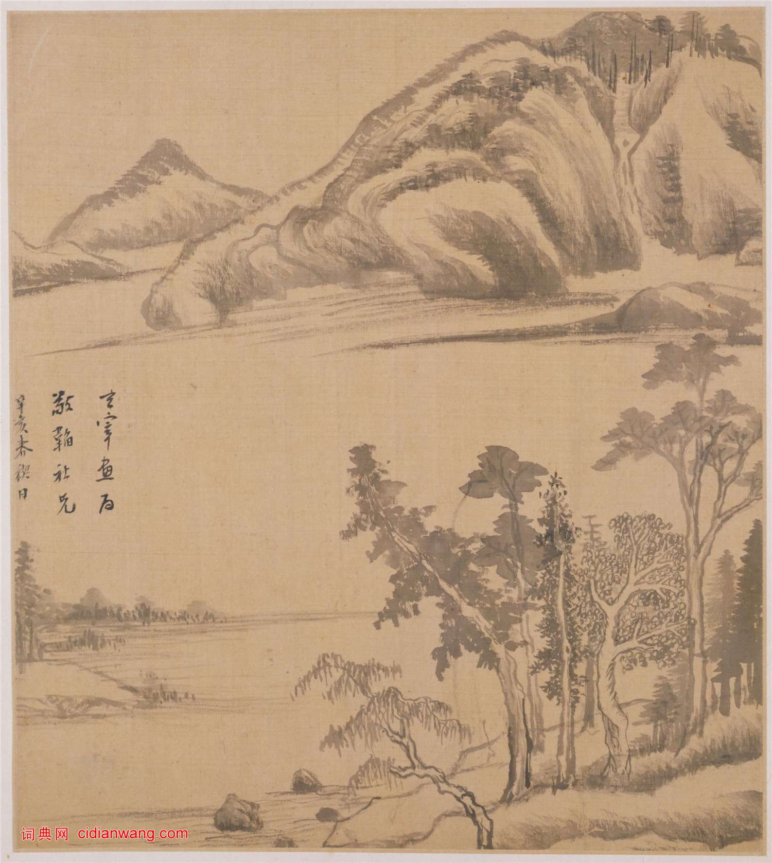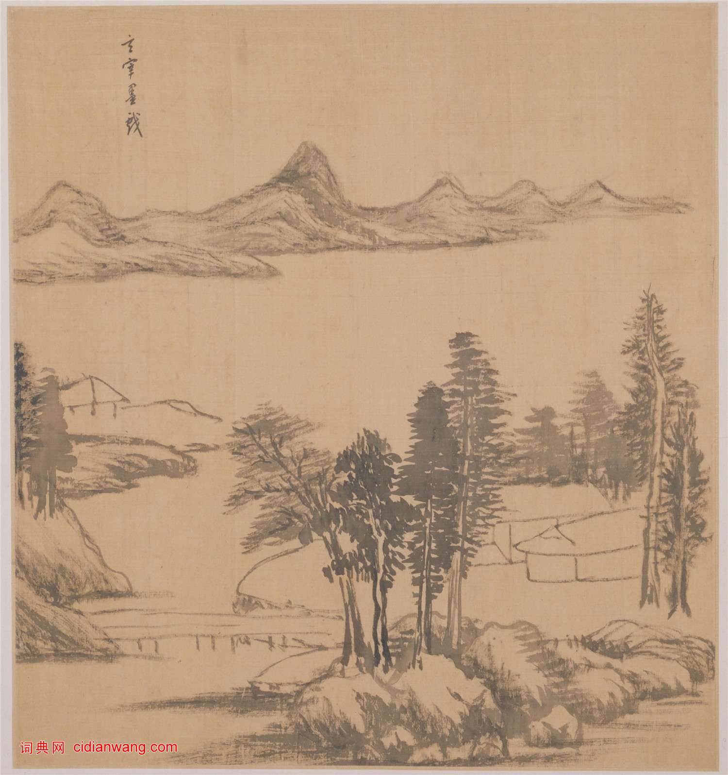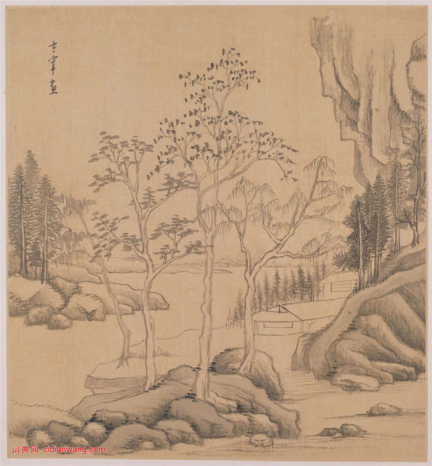 此圖仿元代倪瓚的筆意及構圖,以平遠的章法、淡逸疏朗的筆墨意趣突出表現雜樹之態,樹後可見溪亭遠山。層疊的坡石連勾帶皴,墨色濃淡變化相宜。遠山以乾筆皴擦,意境空濛。第三開,本幅自題:“仿黃鶴山樵。玄宰。”
