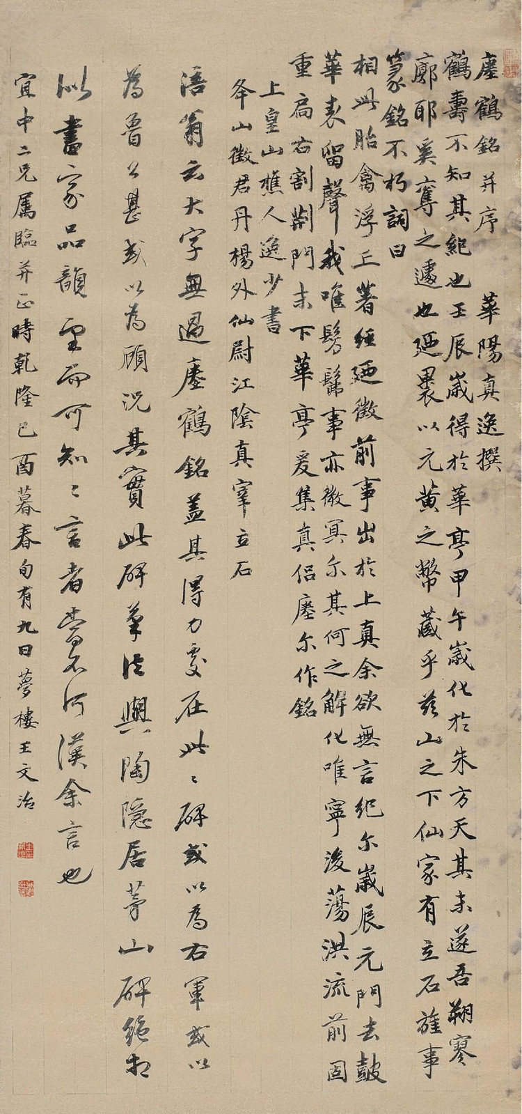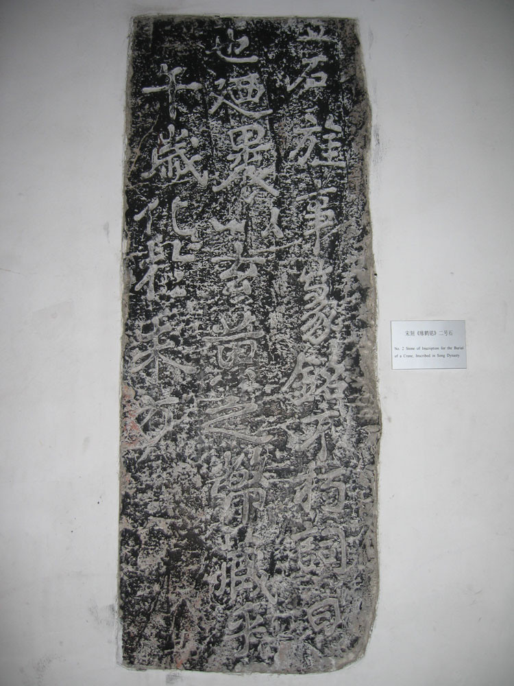 鶴壽不知其紀也,壬辰歲得扵華亭,甲午歲化扵朱方。天其未遂,吾翔寥廓耶?奚奪余仙鶴之遽也。乃褁以玄黃之巾,藏乎茲山之下,仙家無隱晦之志,我等故立石旌事篆銘不朽,詞曰:相此胎禽,浮丘之真,山隂降跡,華表留聲。西竹法理,幸丹歲辰。真唯仿佛,事亦微冥。鳴語化解,仙鶴去莘,左取曹國,右割荊門,後蕩洪流,前固重局,余欲無言,爾也何朙?宜直示之,惟將進寧,爰集真侶,瘞爾作銘。