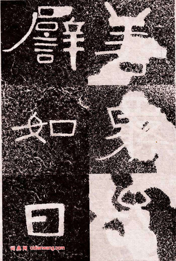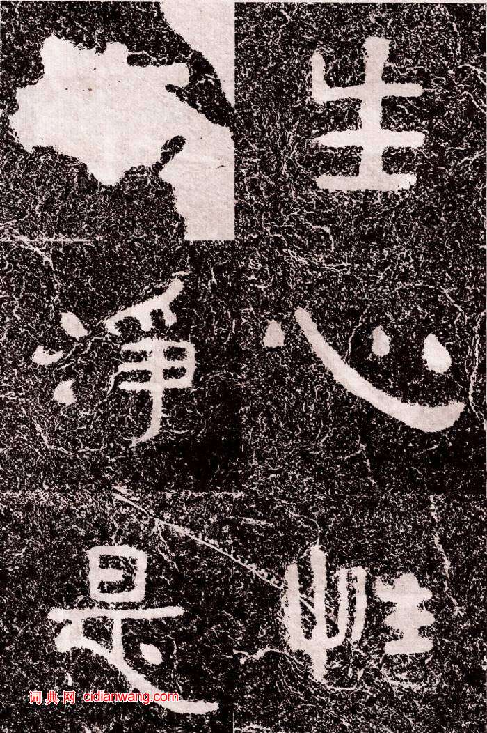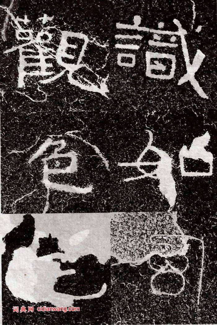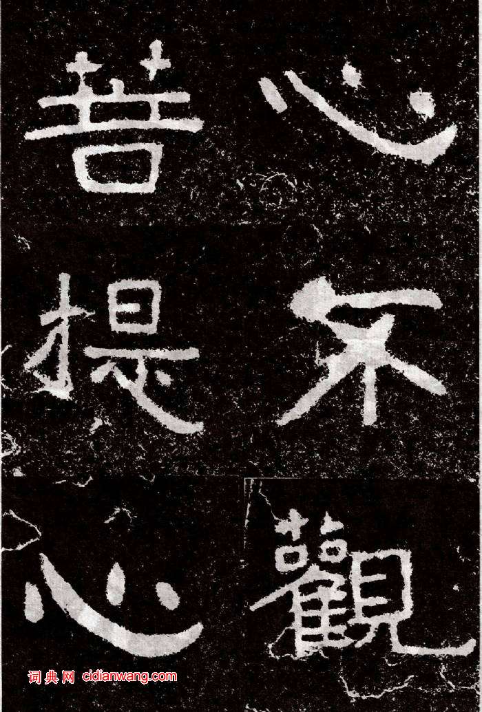 鐵山刻石南北長66.2米,東西寬16.2米,面積1085平方米。刻石的內容可分為經文、石頌、頌文和題名四部分。經文,是摩崖刻經的主要部分。南北排列17行,行59字,最多者60字,最少者僅6字。共944字,現能夠辯認795字。經文排列整齊,行距均勻,界格清晰。字大如斗,字徑一般在45—60厘米之間。其場面博大,氣勢恢宏。刻經內容為佛教《大集經·穿菩提品》。《大集經》全稱《大方等大集經》。鐵山經文是該經卷八“海慧菩提品第五之一”的一部分。字型以隸為主,篆楷意味濃厚,間有行草,開闊險峻,寬闊空靈,被譽為“通隸楷、備方圓,為大字鼻祖,榜書之宗”。