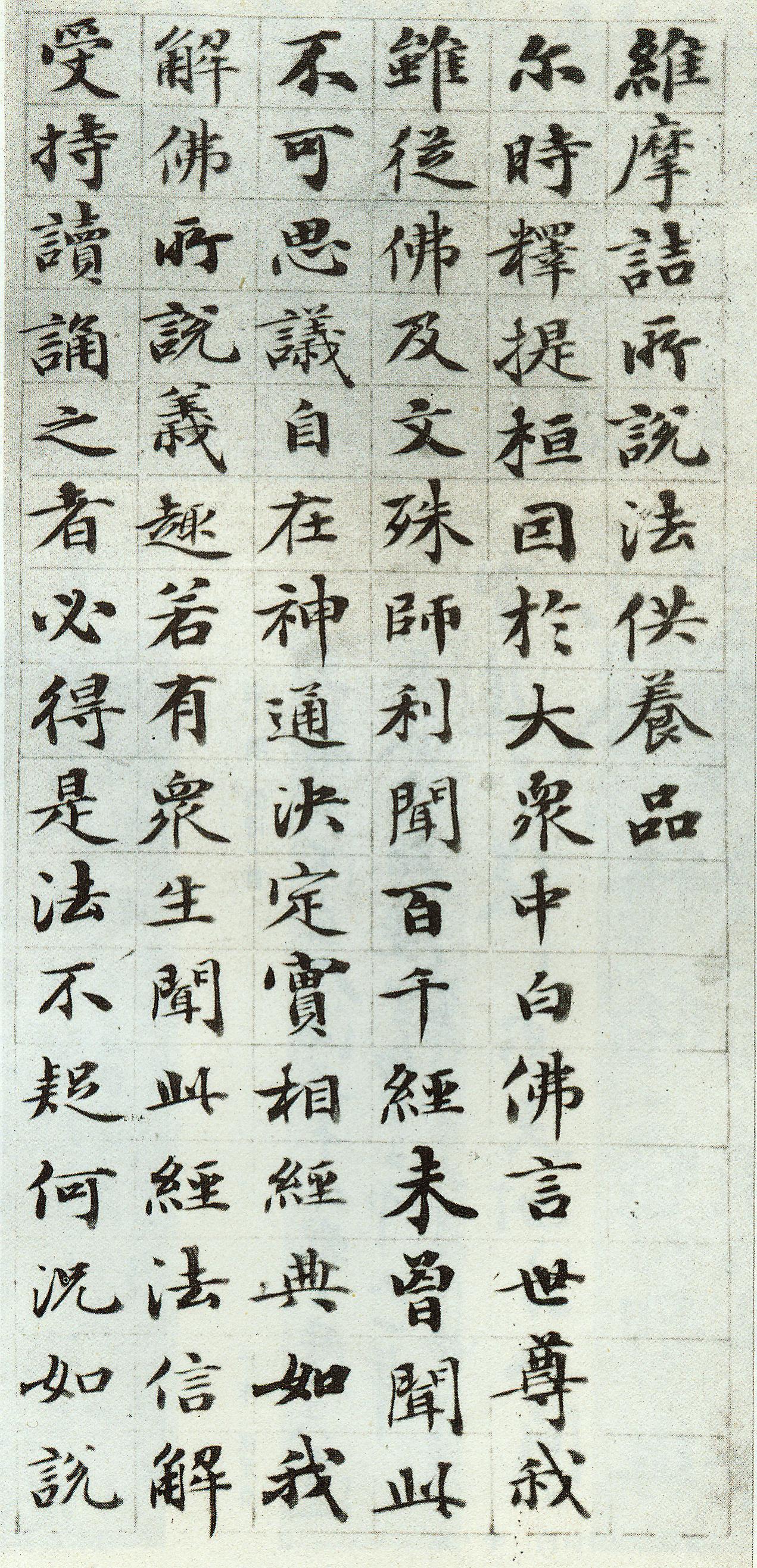 書法欣賞魏晉書法唐朝書法宋朝書法元朝書法明朝書法清朝書法近現代書法字典網>> 歷代書法>> 清朝>> 梁同書·維摩詰所說法供養品正文 梁同書·維摩詰所說法供養品作者:梁同書 書體:小楷 縱26.5厘米,橫11.5厘米,18開,紙本,1976年劉國鈞先生捐。此冊書於嘉慶四年其77歲時。款後鈐有“迷中倍人”朱文小長印,封版由吳昌海楷書署簽,扇頁有陳鴻壽隸書署簽,尾頁有金庭客的“恕齋審定”印和高薌林寶硯齋的收藏印等。前八開寫的是“維摩詰所說法供養品”,後十開寫的是“無量義經德行品”。全冊小楷運筆靈捷,隨意自然,全無刻板習氣,顯得整齊而富有變化,沉著中寓生動,有較高的書法藝術價值。1 2 3 4 5 6 7 8 下一頁 尾 頁梁同書的相關書法作品:梁同書·維摩詰所說法供養品 清代梁同書手札絹本 梁同書·從妹汪安人傳 相關文章:敦煌寫經殘紙書法欣賞敦煌寫經是我國古文獻中的瑰寶,自1900年敦煌寫經卷在敦煌藏經洞被發現後,密藏多...東晉楷書《王興之夫婦墓誌》 (楷書)《王興之夫婦墓誌》 東晉永和四年(348)十月刻釋文:君諱興之,字稚陋。琅耶臨沂...趙孟頫行書《光福寺重建塔記》 (行書)《光福寺重建塔記》,紙本,本幅縱28.6cm,橫284cm,全卷29cm×37...譚延闓行書《勳勞議論七言聯》 (行書)譚延闓《勳勞議論七言聯》描畫蠟箋本行書 166.2×40.9cm×2 台北故...倪元璐行草《山行即事五言詩軸》 (行草)倪元璐《山行即事五言詩軸》綾本行草書 161×46.3cm 日本東京國立博物館...40個學隸書技巧,隸書結構技法隸書,亦稱漢隸,是漢字中常見的一種莊重的字型,書寫效果略微寬扁,橫畫長而直畫短,...米芾《道林詩帖》 (行書)【釋文】道林樓閣鳴(此字點去)明丹堊,杉松振老髯。僧迎方擁帚,茶細鏇探檐。米芾《...鄭燮《行書墨蘭苦茗七言聯》 (行書)鄭燮 《行書墨蘭苦茗七言聯》紙本行書 165×31cm×2 1738年 台北...熊廷弼·致友人手札 (草書)熊廷弼不以書法名世,但其人格、其才能為後世所仰,如傅山就有一段有關熊的記載,崇禎...白蕉《書法十講》第十講 碑與帖 (不詳)第十講 碑與帖 書學上碑與帖的爭論,是遠自乾嘉以來的事。提倡碑的攻擊帖;喜歡帖的...