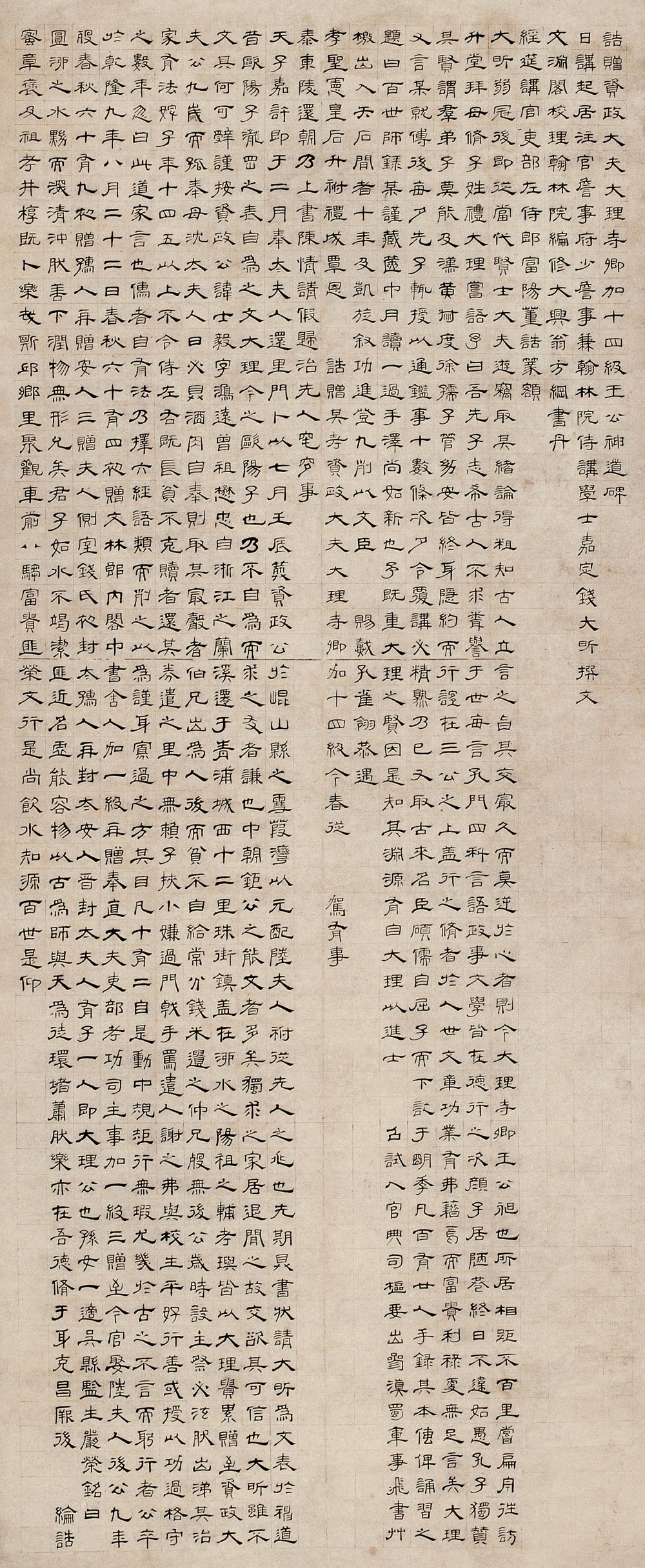 書法欣賞魏晉書法唐朝書法宋朝書法元朝書法明朝書法清朝書法近現代書法字典網>> 歷代書法>> 清朝>> 翁方綱·隸書王昶神道碑正文 翁方綱·隸書王昶神道碑作者:翁方綱 書體:隸書 翁方綱 隸書王昶神道碑,立軸,水墨紙本,182.2×117.5cm。曾經近代名書家仁和(今杭州)高邕之(1850-1921)收藏。翁方綱的相關書法作品:翁方綱《行書七絕詩軸》 翁方綱·行書七言詩 翁方綱《隸書池上竹間七言聯》 翁方綱行書《斜街行立軸》 翁方綱隸書《翁方綱漢隸四種》 翁方綱·隸書王昶神道碑 翁方綱行書《論化度寺碑軸》 翁方綱·行書立軸 相關文章:陳淳行書《杜甫秋興八首》 (行書)陳淳行書《杜甫秋興八首》 紙本 釋文:玉露凋傷楓樹林,巫山巫峽氣蕭森。江間波浪兼...傅山草書《杜甫對雨書懷走邀許十一簿公詩》 (草書)傅山《草書杜甫對雨書懷走邀許十一簿公詩》絹本 154×51.6cm。天津博物館...張雨行書《自書詩冊》 (行書)至正五年(1345) 張雨《自書雜詩冊》粉花箋 23.7×15.3cm×24...蔡襄楷書《謝賜御書詩表》 (楷書)蔡襄楷書《謝賜御書詩表》 宋仁宗帝曾御書“君謨”賜蔡襄。為報答皇恩,蔡襄恭作表文...吳榮光行書《錄李商隱漫成一首詩軸》 (行書)吳榮光《錄李商隱漫成一首詩軸》紙本行書 105.8×30.5cm 北京故宮博物...劉宗周·桃花源記 (行草)劉宗周《桃花源記》,行草,現藏朵雲軒。王羲之·草書平安帖 (草書)【釋文】十二月六日。告姜道等。歲忽終。感嘆情深。念汝不可徃。得去十月書。知姜等平...吳榮光《行書四條屏》 (行書)吳榮光《行書四條屏》,廣東省立中山圖書館藏。刊於廣東省書法家協會《書藝》卷四(2...鄭燮《草書七律》 (草書)鄭燮《草書七律》 紙本 91×51cm 西泠印社藏資料來自《西泠印社百年社藏...吳寬行書《和體齋賞荷詩一首扇面》 (行書)吳寬《和體齋賞荷詩一首扇面》紙本金箋行書 17.5×49.5cm 美國紐約大都...