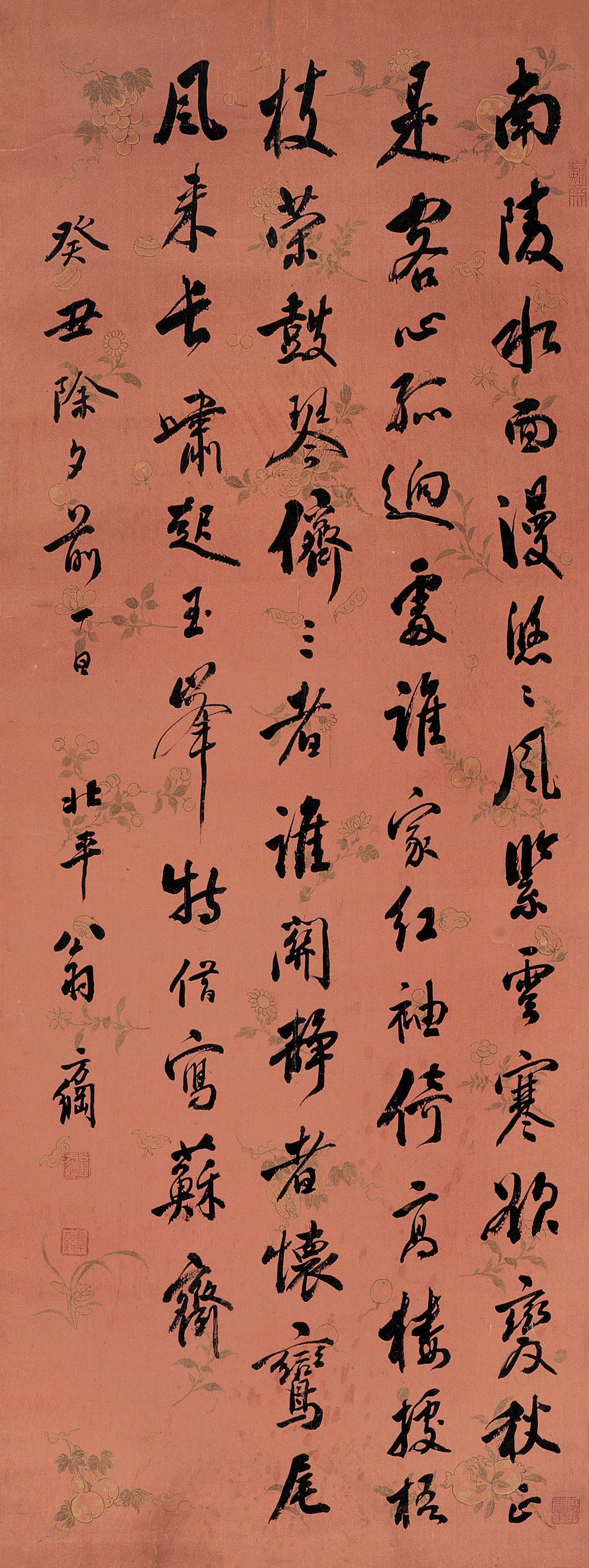 書法欣賞魏晉書法唐朝書法宋朝書法元朝書法明朝書法清朝書法近現代書法字典網>> 歷代書法>> 清朝>> 翁方綱·行書七言詩正文 翁方綱·行書七言詩作者:翁方綱 書體:行書 翁方綱 癸丑(1793年)作 行書七言詩 立軸。翁方綱的相關書法作品:翁方綱隸書《翁方綱漢隸四種》 翁方綱·行書立軸 翁方綱·行書七言詩 翁方綱·隸書王昶神道碑 翁方綱行書《斜街行立軸》 翁方綱《隸書池上竹間七言聯》 翁方綱行書《論化度寺碑軸》 翁方綱《行書七絕詩軸》 相關文章:宋克《草書韓偓七絕條幅》 (草書)《草書韓偓七絕條幅》,100cm×32cm,山西省博物館藏。釋文:遐方不許貢珍...沈度·敬齋箴冊 (小楷)沈度《敬齋箴冊》,楷書,縱23.8cm,橫49.4cm。北京故宮博物院藏。款署“...趙之琛篆書《摹古軸》 (篆書)趙之琛《篆書摹古軸》紙本篆書 131.5×60.5cm 南京博物院藏釋文:唯三...王獻之·新婦地黃湯帖 (行草)【釋文】獻之白:思戀,觸事彌至。獻之既欲過餘杭,州將若比還京,必視之。來月十左右...陳鴻壽《行書七言詩軸》 (行書)陳鴻壽《行書七言詩軸》紙本行書 127×54cm 濟南市博物館藏釋文:月與...王維賢楷書《少年進德錄》 (楷書)(清末民初)王維賢楷書作品欣賞 王維賢 字竹村,天津人。為津南大名鼎鼎的歐楷名家...朱彝尊《隸書茆齋釣艇五言聯》 (隸書)朱彝尊《隸書茆齋釣艇五言聯》123.5×29cm×2 貴州省博物館藏 釋文:...敬客《王居士磚塔銘》 (楷書)《王居士磚塔銘》也叫《王公磚塔銘》唐顯慶三年(658)十月月二十六日入窆,明萬曆...文徵明小楷《前後赤壁賦》拓本 (小楷)文徵明小楷作品欣賞《前後赤壁賦》,衡山居士書法赤壁兩賦寫過多種,書於嘉靖乙巳年(...劉墉行書《食筍截筒七言聯》 (行書)劉墉《食筍截筒七言聯》紙本行書 132.8×30.6cm×2 台北故宮博物院...