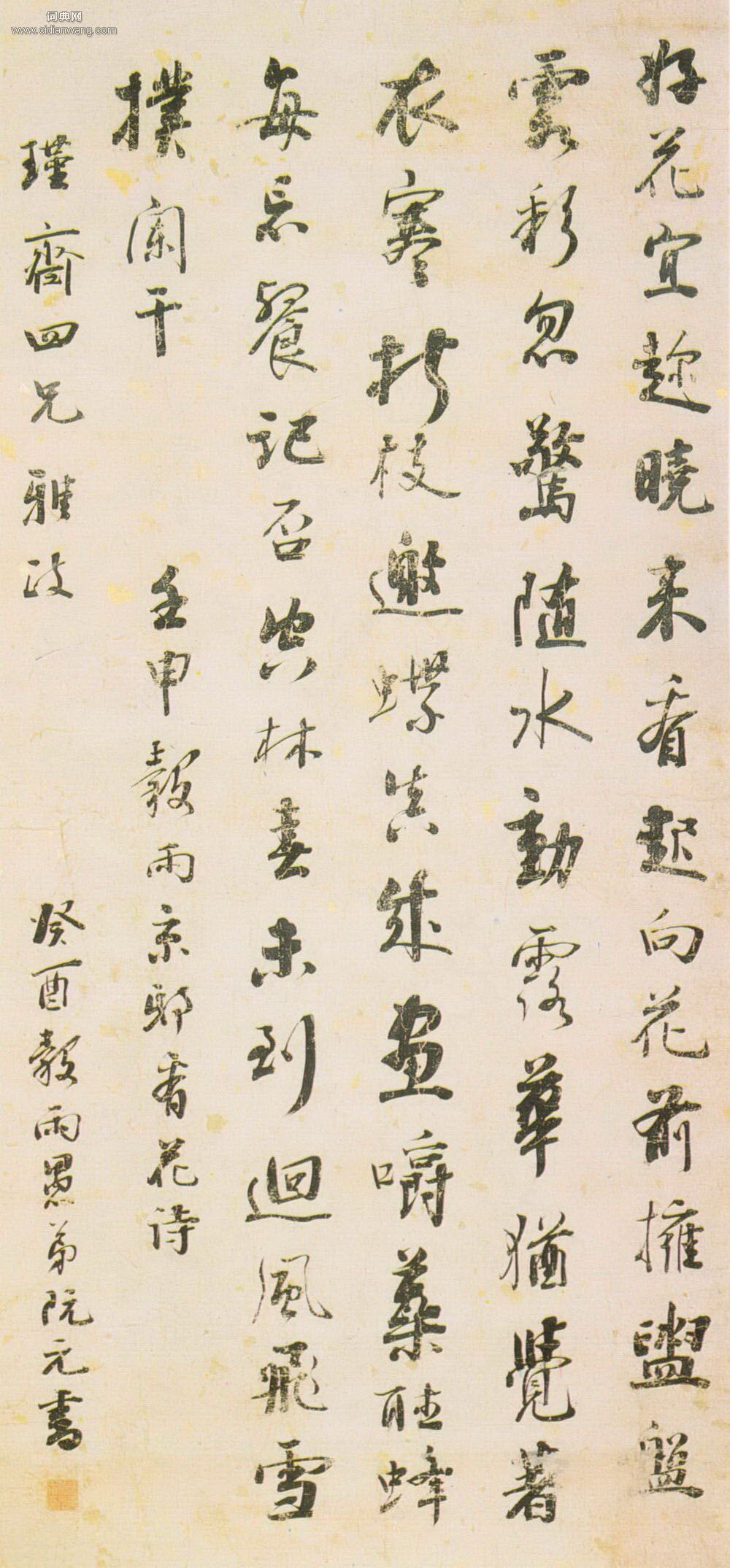書法欣賞魏晉書法唐朝書法宋朝書法元朝書法明朝書法清朝書法近現代書法字典網>> 歷代書法>> 清朝>> 阮元《京邸看花詩》正文 阮元《京邸看花詩》作者:阮元 書體:行書 阮元《行書京邸看花詩》,嘉慶十八年(癸酉)1813年,時年50歲,為瑾齋作。阮元的相關書法作品:阮元《京邸看花詩》 阮元《隸書含和年豐八言聯》 阮元《行書題畫詩軸》 阮元·《石畫記》底稿 阮元·行書卷 阮元《行書偶試但拋七言聯》 阮元《臨乙瑛碑》 相關文章:胡問遂節臨《鄭文公碑》 (楷書)《鄭文公碑》,全稱《魏故中書令秘書監使持節督兗州諸軍事安東將軍兗州刺史南陽文公鄭...文徵明《跋右軍十七帖》 (楷書)文徵明《跋右軍十七帖》,楷書。《十七帖》為書聖王羲之的草書代表之作,不過原跡早已...中峰明本行書《與濟侍者警策》 (行書)中峰明本《與濟侍者警策》 31.5X67.3cm 日本神奈川縣鎌倉市常盤山文庫藏...徐渭 《墨葡萄》行書題款 (行書)徐渭 《墨葡萄》 軸 紙本 浙江省博物館藏 書法題款劉魁·跋范仲淹《道服贊》 (楷書)【釋文】黃山谷古今名書者猶推文正公小楷筆精而瘦勁自得古法世人可不知所重耶成化辛丑...賀知章《草書孝經》 (草書)賀知章《草書孝經》縱26.0厘米橫265.1厘米日本宮內廳三之丸尚藏館本卷以草書...張大千罕見的書法手稿 (行草)張大千罕見的書法手稿好稀罕,那個時代的酒店居然有旅客用箋 …大概相當於今天的留言...張瑞圖行書《“尋幽并轡入仙家”七言律詩軸》 (行書)張瑞圖《“尋幽并轡入仙家”七言律詩軸》綾本行書 303×77cm 戊辰(162...北魏《元倪墓誌》 (楷書)北魏《元倪墓誌》,全稱《魏故寧遠將軍敦煌鎮將元君墓志銘》。北魏正光四年(523)...大雅集王羲之半截碑《吳文殘碑》 (行書)大雅集王羲之行書半截碑《吳文殘碑》,吳文殘碑書法字帖。北京圖書館藏中國歷代石刻拓...