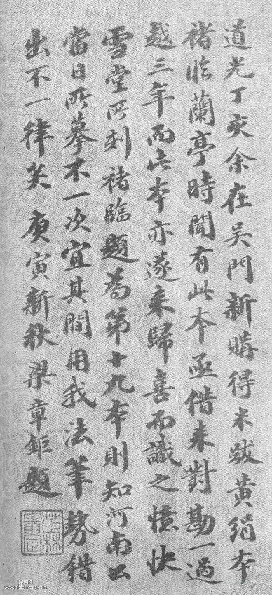 書法欣賞魏晉書法唐朝書法宋朝書法元朝書法明朝書法清朝書法近現代書法字典網>> 歷代書法>> 清朝>> 梁章鉅·跋《唐摹蘭亭序》正文 梁章鉅·跋《唐摹蘭亭序》作者:梁章鉅 書體:行楷 【釋文】道光丁亥,余在吳門新購得米跋黃絹本《褚臨蘭亭》時,聞有此本,亟借來對勘一過,越二年,而此本亦遂來歸,喜而識之。憶快雪堂所刻褚臨題為第十九本,則知河南公當日所摹不一次,宜其間用我法,筆勢錯出不一律矣。庚寅新秋梁章鉅題。 此本鋒棱頗露,不若米跋本之精腴,觀者自能辨之。壬辰歸舟次嚴公釣台下,以兩本對勘,傍識數字。茞林。梁章鉅跋《唐摹蘭亭序》,行楷書。湖南省博物館藏。在嘉慶、道光年間,此《唐摹蘭亭序》輾轉歸於梁章鉅手。梁章鉅的相關書法作品:梁章鉅·跋《唐摹蘭亭序》 梁章鉅·跋《李文及妻劉氏合葬墓誌》 相關文章:蔡襄《腳氣帖》 (行草)【釋文】仆自四月以來,輒得腳氣發腫,入秋乃減,所以不辭北行,然於湖山佳致未忘耳。...李陽冰篆書《顏家廟碑額》 (篆書)李陽冰篆書《顏家廟碑額》 ,西安碑林藏。釋文: 顏氏家廟之碑。蘇軾行書《令子帖》 (行書)蘇軾《令子帖》 書於紹元年(1094)。紙本。行書,尺牘一則。凡4行,計50字。...康里巎巎行書題周朗《杜秋娘圖卷》 (行書)康里巎巎 題周朗《杜秋娘圖卷》 紙本 縱32.3cm 至元二年(1336) 北...唐順之《草書贈江陰陳隱君詩卷》 (草書)唐順之《草書贈江陰陳隱君詩卷》 紙本草書 27.5×74.6cm 上海博物館藏...蔡襄·致彥猷尺牘 (行書)【釋文】襄啟:大研盈尺,風韻異常,齋中之華,繇是而至。花盆亦佳品,感荷厚意。以珪...翁方綱·行書七言詩 (行書)翁方綱 癸丑(1793年)作 行書七言詩 立軸。全國第一屆書法篆刻展作品集-草書部分1980年5月,全國第一屆書法篆刻展覽(國展)在瀋陽展出,現與大家分享由人民美術...陳洪綬行書《自書歲前三日五言詩》扇面 (行書)陳洪綬《自書歲前三日五言詩》扇面 紙本 上海博物館藏圖片由年莊提供 ...沈曾植《行書江蓮野竹五言聯》 (行書)沈曾植《行書江蓮野竹五言聯》紙本行書 134×33cm×2 平湖市博物館藏 ...