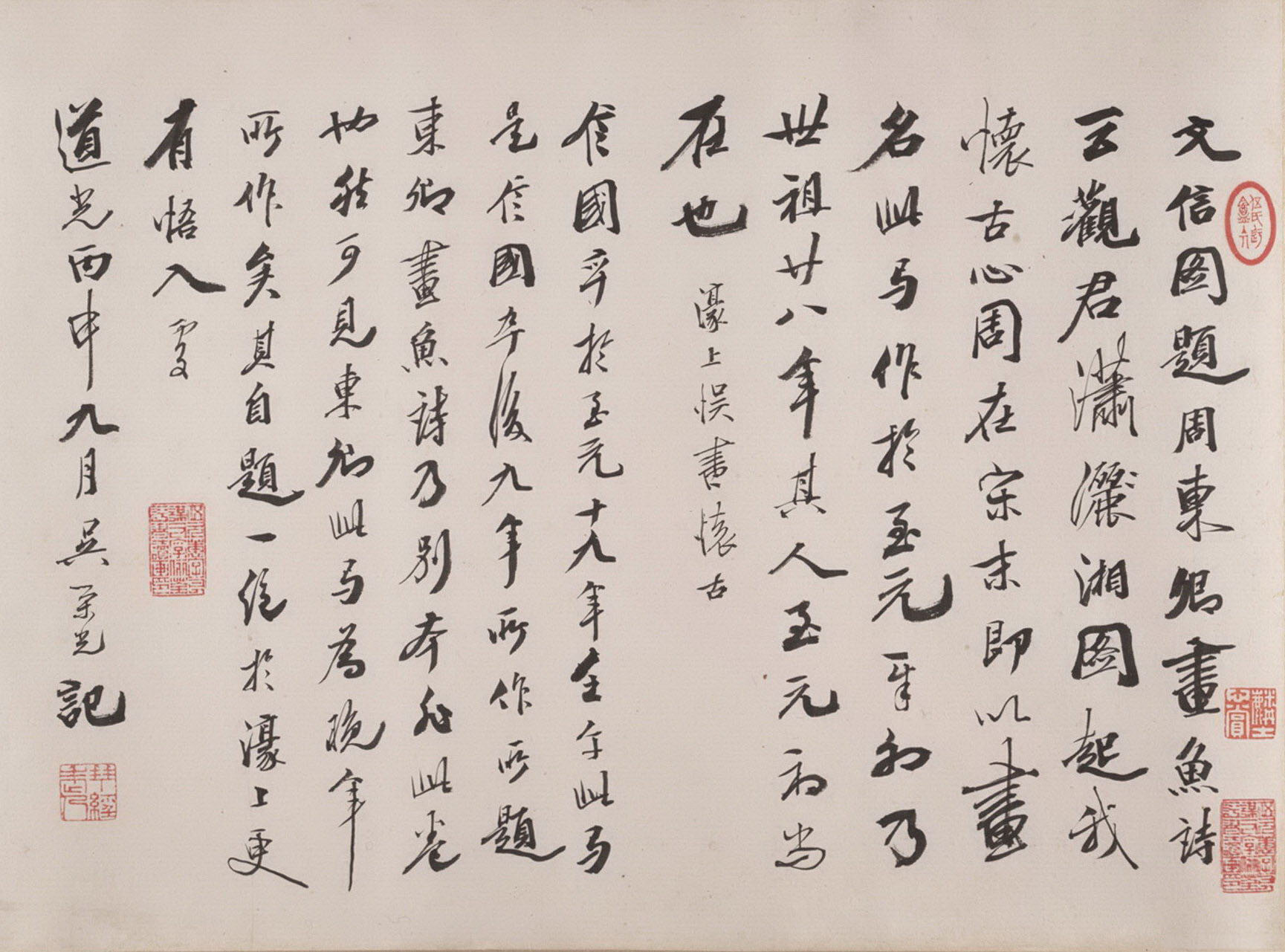 書法欣賞魏晉書法唐朝書法宋朝書法元朝書法明朝書法清朝書法近現代書法字典網>> 歷代書法>> 清朝>> 吳榮光·跋周東卿《魚樂圖》正文 吳榮光·跋周東卿《魚樂圖》作者:吳榮光 書體:行書 吳榮光跋周東卿《魚樂圖》,縱30.8厘米,現藏於美國大都會美術館。吳榮光的相關書法作品:吳榮光行書《致晴圃書札》 吳榮光·臨王羲之《游目帖》 吳榮光行書《錄李商隱漫成一首詩軸》 吳榮光·跋周東卿《魚樂圖》 吳榮光《致晴圃書札》 吳榮光《行書四條屏》 吳榮光《中堂袁清容詩》 相關文章:趙孟頫·跋蘇軾《治平帖》 (行書)趙孟頫跋蘇軾《治平帖》,行書,北京故宮博物院藏。釋文:右二帖蘇東坡早年真跡,與其...沈曾植《行書杜甫秋盡詩扇面》 (行書)沈曾植《行書杜甫秋盡詩扇面》紙本行書 18×52cm 平湖市博物館藏 釋文:秋...虞世南《大運帖》 (楷書)【釋文】世南聞大運不測,天地兩平;風俗相承,帝基能厚;道清三百,鴻業六超;君壽九...董其昌行書《書畫合冊》 (行書)書畫合冊,無錫博物館藏 這是董其昌的“書畫合冊”行書三。此冊藏無錫博物館,書法六...張謇《行楷書更俗劇場聯》 (行楷)張謇《行楷書更俗劇場聯》紙本行楷書 303.5×50.8cm×2 南通博物苑...華喦行書《題桃潭浴鴨圖》 (行書)華喦 《桃潭浴鴨圖》紙本 設色 271.5×137cm 1742年 北京故宮博...吳玉如楷書《杜甫瘦馬行》 (楷書)吳玉如《楷書杜甫瘦馬行》 釋文:東郊瘦馬使我傷,骨骼硉兀如堵牆。絆之欲動轉欹側,...小心!書法七大惡習書法惡習泛指用筆、結體等方面流於熟濫、庸俗,缺乏高雅的情調。對於書者而言,了解其...王時敏《隸書軸》 (隸書)王時敏《隸書軸》,紙本,196×76厘米。 王時敏寫這件作品時已86歲,此作在...朱耷《草書題畫詩軸》 (草書)朱耷《草書題畫詩軸》紙本草書 123.9×47.2cm 首都博物館藏釋文:月川...