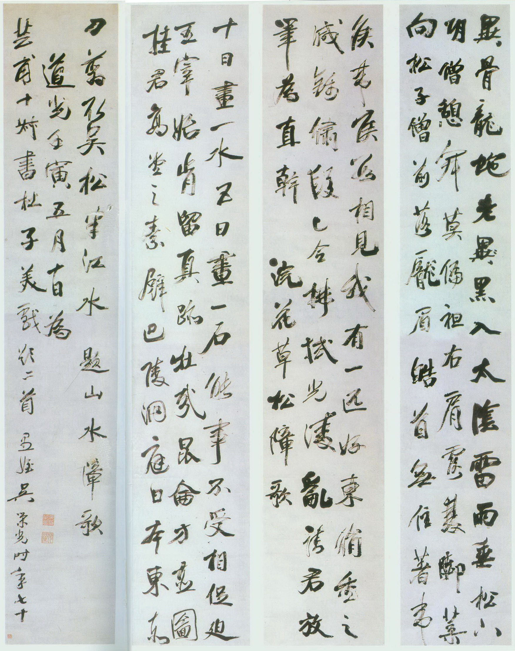 書法欣賞魏晉書法唐朝書法宋朝書法元朝書法明朝書法清朝書法近現代書法字典網>> 歷代書法>> 清朝>> 吳榮光《行書四條屏》正文 吳榮光《行書四條屏》作者:吳榮光 書體:行書 吳榮光《行書四條屏》,廣東省立中山圖書館藏。刊於廣東省書法家協會《書藝》卷四(2003.3嶺南美術出版社)。吳榮光的相關書法作品:吳榮光《行書四條屏》 吳榮光《中堂袁清容詩》 吳榮光行書《錄李商隱漫成一首詩軸》 吳榮光《致晴圃書札》 吳榮光行書《致晴圃書札》 吳榮光·跋周東卿《魚樂圖》 吳榮光·臨王羲之《游目帖》 相關文章:傅蓮蘇《行書杜甫飲中八仙歌》 (行書)傅蓮蘇是傅山之孫,傅眉之子,生卒年不詳,字岩裔(一字長芳),山西陽曲人。才華橫溢...張裕釗楷書《贈沈曾植書》 (楷書)張裕釗《贈沈曾植書》紙本楷書 118×53.5cm 嘉興博物館藏【資料來源】《...孩子學書法的好處台灣教育界有句名言,就是“學書法的孩子不會學壞”,根據調查,一般學習書法的孩子學...黃庭堅行書《王史二氏墓志銘稿卷》 (行書)黃庭堅《王史二氏墓志銘稿卷》 紙本 30.3×78.5lcm 33.5×65...張瑞圖楷書《王蒼坪墓誌》 (楷書)張瑞圖《王蒼坪墓誌》志蓋(篆書) 鄲城縣博物館藏 張瑞圖《王蒼坪墓誌》志蓋(楷書...范成大·跋李結《西塞漁舍圖》 (行書)范成大跋李結《西塞漁舍圖》,縱40.7厘米。大都會美術館藏。南宋著名山水畫家、毗...什麼是永字八法一、點為側(如鳥之翻然側下)側是傾斜不正之意,點應取傾斜之勢,如巨石側立,險勁而...趙孟頫《江南淨土詞十二首》 (行書)至元二十三年(1286年),行台侍御史程鉅夫“奉詔搜訪遺逸於江南”,將趙孟頫引見...唐高宗李治行書《李勣碑》 (行書)唐高宗《李勣碑》,全稱《贈太尉英貞武公李勣碑》,鐫於儀鳳二年(677年)在陝西醴...蘇軾《天際烏雲帖》 (行書)北宋 蘇軾 《天際烏雲帖》又稱《嵩陽帖》,蘇軾詩文一章,行書,真跡曾由明代項元汴...