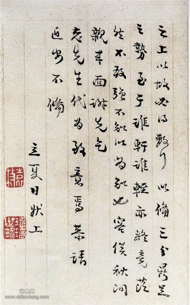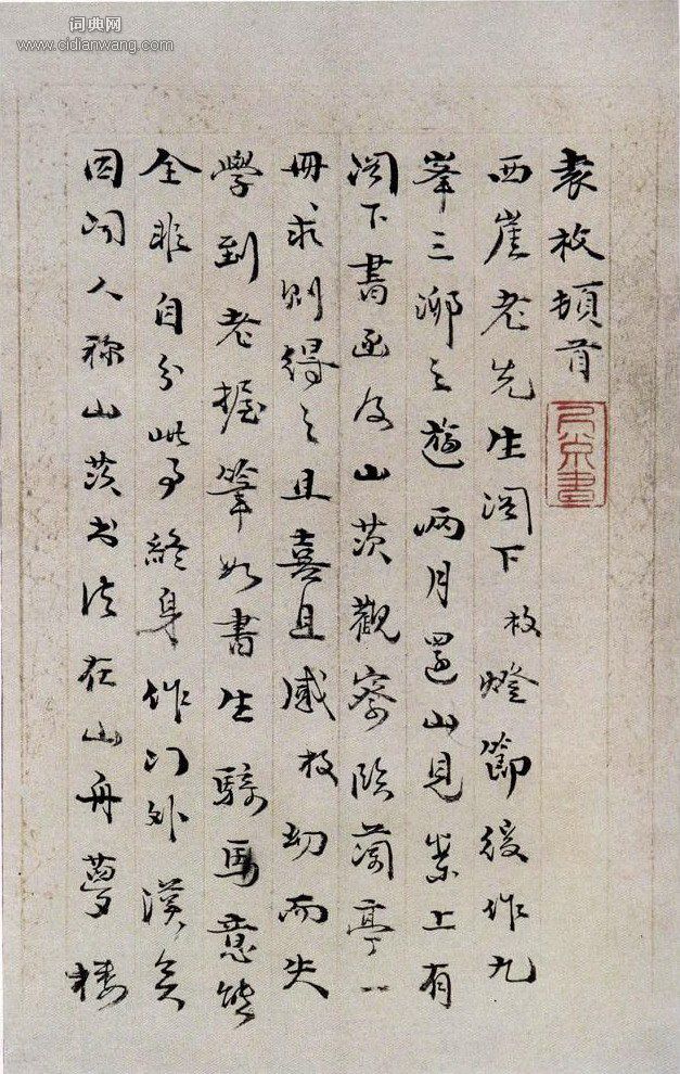 書法欣賞魏晉書法唐朝書法宋朝書法元朝書法明朝書法清朝書法近現代書法字典網>> 歷代書法>> 清朝>> 袁枚《致西崖書札》正文 袁枚《致西崖書札》作者:袁枚 書體:行書 【釋文】袁枚頓首。西崖老先生閣下:枚燈節後作九峰、三泖之游,兩月還山、見案上有閣下書函及山茨觀察臨《蘭亭》一冊,求則得之,且喜且感。枚幼而失學,到老握筆,如書生騎馬,意態全非,自分此事終身作門外漢矣。因聞人稱山茨書法在山舟、夢樓之上,以故必得數行,以備三分鼎足之勢,至於誰軒認輊,亦終竟茫然,不敢強不知以為知也。容俟秋間親來而謝,先乞老先生代為致意焉。恭請近安,不備。立夏日狀上。袁枚《致西崖書札》。袁枚的相關書法作品:袁枚《致西崖書札》 袁枚《致尤蔭手札》 相關文章:蘇軾小楷《金剛經》 (小楷)《金剛經》是佛教的重要經典,根據不同譯本,全名略有不同。《金剛經》,全稱為《金剛...啟功小楷《失眠口占小品》 (小楷)啟功老先生的小楷作品,下面的這幾幅算是口占小品,我覺得可能就是他在日常生活中記錄...于右任行書《藏書紀事詩軸》 (行書)于右任《藏書紀事詩軸》 131.4×31.5cm 台北故宮博物院藏...趙孟頫楷書《東銘》 (楷書)趙孟頫楷書《東銘》書寫的是北宋哲學家、理學創始人張載的一篇文章。《東銘》即《砭愚...鍾繇《宣示表》 (楷書)《宣示表》故宮博物院藏,梁武帝蕭衍譽道“勢巧形密,勝於自運”。筆法質樸渾厚,雍容...戴熙《行書組織莩甲八言聯》 (行書)戴熙《行書組織莩甲八言聯》 珊瑚箋行書 165×31cm×2 常州博物館藏 ...趙孟頫《行書十札卷》 (行書)得益於趙室宗族子弟藝術方面系統、全面的訓練,趙孟頫的眼界、學識與藝術功底都堪稱一...張裕釗《行書沙苑天街七言聯》 (行書)張裕釗《行書沙苑天街七言聯》紙本行書 129×31cm×2 深圳市博物館藏釋...王世貞·跋范仲淹《道服贊》 (行書)王世貞跋范仲淹《道服贊》,行書,縱34.8cm,北京故宮博物院藏。釋文:範文正楷...顏真卿·元次山碑 (楷書)宋拓元次山碑《元次山碑》,又名《容州都督元結碑》,全稱《唐故容州都督兼御史中丞本...