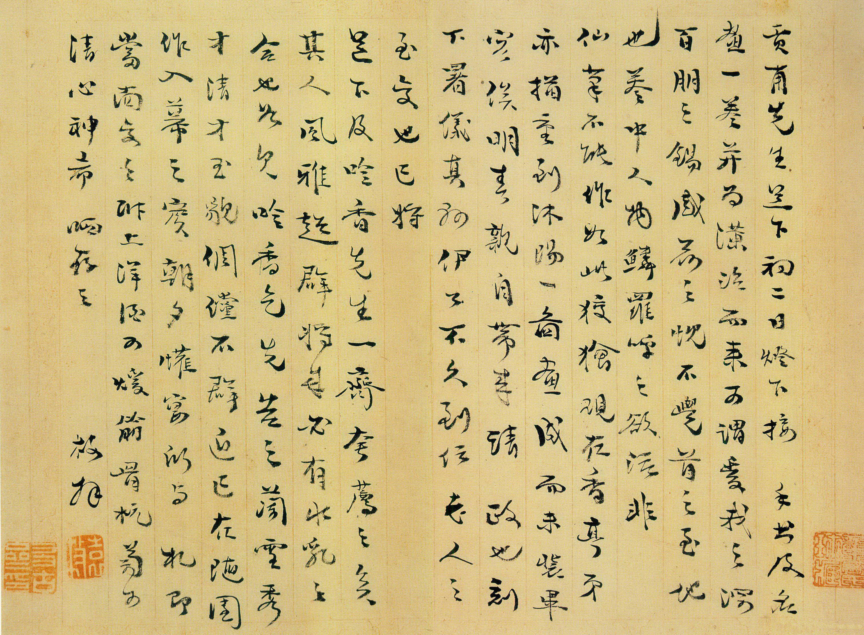 書法欣賞魏晉書法唐朝書法宋朝書法元朝書法明朝書法清朝書法近現代書法字典網>> 歷代書法>> 清朝>> 袁枚《致尤蔭手札》正文 袁枚《致尤蔭手札》作者:袁枚 書體:行書 袁枚《致尤蔭手札》。此致尤蔭(字貢父)札內容為謝尤贈畫,並贊其畫,記述朋友間切壁畫藝及朋友間相互激賞、互贈禮物之韻事。其書法靈動清雅,不事雕琢,自然閒適,正合於其“性靈”之主張。雖法度稍欠,而才情橫溢,亦為佳構。袁枚的相關書法作品:袁枚《致西崖書札》 袁枚《致尤蔭手札》 相關文章:趙孟頫行書 《煙江疊嶂圖》 (行書)《煙江疊嶂圖》是宋代大畫家王冼的作品,蘇東坡在欣賞王冼的這件作品之後寫下了《書王...梁同書·維摩詰所說法供養品 (小楷)縱26.5厘米,橫11.5厘米,18開,紙本,1976年劉國鈞先生捐。此冊書於嘉...傅蓮蘇《行書杜甫飲中八仙歌》 (行書)傅蓮蘇是傅山之孫,傅眉之子,生卒年不詳,字岩裔(一字長芳),山西陽曲人。才華橫溢...米芾《韓馬帖》 (行書)【釋文】芾頓首啟:前日幸披晤。即日起居沖勝。韓馬預借三五日,節中數貴游宴集處使之...黃姬水行書《送徐檢庵還朝詩軸》 (行書)黃姬水《行書送徐檢庵還朝詩軸》紙本行書 58.3×31.3cm 天津博物館藏釋...林散之《楷書自作詩示秋水》 (楷書)林散之《楷書自作詩示秋水》 20×30cm 李秋水藏釋文:稼穡艱難筆代耕,百花...鮮于樞行書《王安石雜詩卷》 (行書)鮮于樞《王安石雜詩卷》縱50厘米 橫1025厘米 遼寧博物館藏鮮于樞《王安石雜詩...趙構真草《嵇康養生論卷》 (草書)宋高宗趙構真草書法欣賞《嵇康養生論卷》紙本,縱23.5厘米,橫602.8厘米,上...蕭衍章草《異趣帖》 (章草)梁武帝,南朝梁的開國皇帝。字叔達,南蘭陵中都里(現江蘇武進縣)人。他原來是南朝齊...全國第三屆書法篆刻展作品集全國第三屆書法篆刻展作品集,1987年10月,河南美術出版社出版: