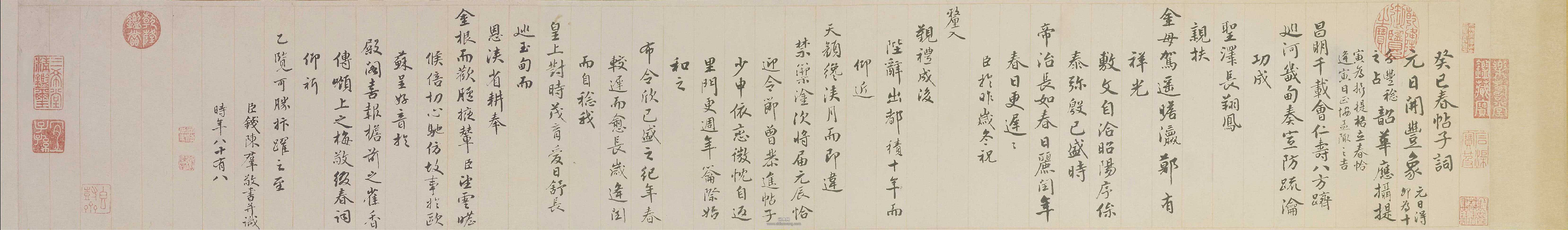 《春帖子詞》卷,清,錢陳群書,紙本金絲欄,行書,縱17.2cm,橫107.6cm。北京故宮博物院藏。