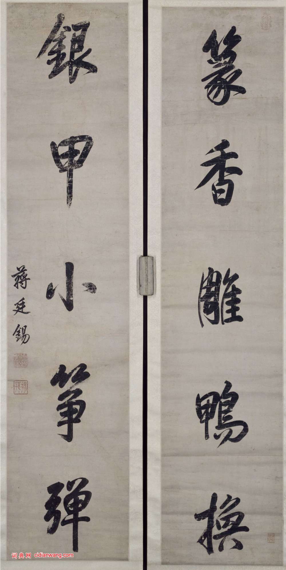 書法欣賞魏晉書法唐朝書法宋朝書法元朝書法明朝書法清朝書法近現代書法字典網>> 歷代書法>> 清朝>> 蔣廷錫《行書五言聯》正文 蔣廷錫《行書五言聯》作者:蔣廷錫 書體:行書 【釋文】篆香雕鴨換,銀甲小箏彈。蔣廷錫。清 蔣廷錫書《行書五言聯》,紙本 ,縱125cm,橫27cm。北京故宮博物院藏。鈐“蔣廷錫印”、“揚孫”、“御題揖翠堂”印3方。此幅對聯用筆蒼勁,風神生動,是甚少見到的蔣廷錫書法佳作。2015-6-25 12:51:56 相關文章:王時敏《隸書軸》 (隸書)王時敏《隸書軸》,紙本,196×76厘米。 王時敏寫這件作品時已86歲,此作在...呂祖謙《文潛帖》 (行書)【釋文】祖謙上覆。文潛至孝知府朝議兄,謹此附承慰唁。拳拳之意,不殊前幅。中甫昆仲...王寵《自書游包山詩》草書手卷 (草書)王寵《自書游包山詩》手卷,砑花箋,草書,382×29厘米 天津藝術博物院藏 卷...瞧!這才是古法造紙【導讀】手造的楮皮紙,不及機械紙平滑光潔,但筆觸墨染與這些草屑雜質相遇處,便有了...楊維楨行書 《題鄒復雷春訊息圖卷》 (行書)楊維楨《題鄒復雷春訊息圖卷》並題跋,行書。美國弗利爾美術館藏。 楊維楨的書法亦如...鄭燮《行書七言詩軸》 (行書)鄭燮《行書軸》 105 x 50 台北故宮博物院藏(蘭千山館暫存)釋文:皓首歸...新莽《萊子侯刻石》 (隸書)新莽天鳳三年(15年)二月刻。原石發現於山東鄒城市臥虎山下,現存山東曲阜孔廟啟聖...中峰明本行書《與濟侍者警策》 (行書)中峰明本《與濟侍者警策》 31.5X67.3cm 日本神奈川縣鎌倉市常盤山文庫藏...倪元璐《節錄左思“蜀都賦”草書軸》 (草書)倪元璐《節錄左思“蜀都賦”草書軸》綾本草書,156.5×49.5cm。日本兵庫...王穉登·義興雜詩冊 (行書)王穉登《義興雜詩》冊,紙本,縱二四點八厘米、橫一五點二厘米,計二五頁,每頁四行,...
